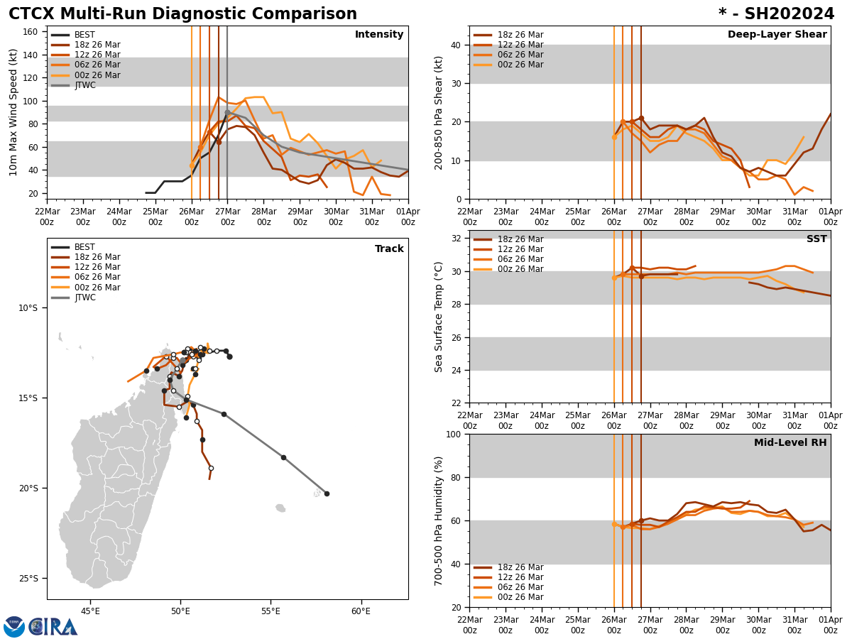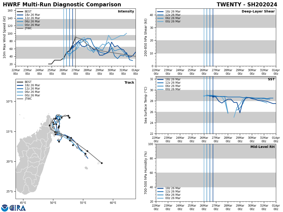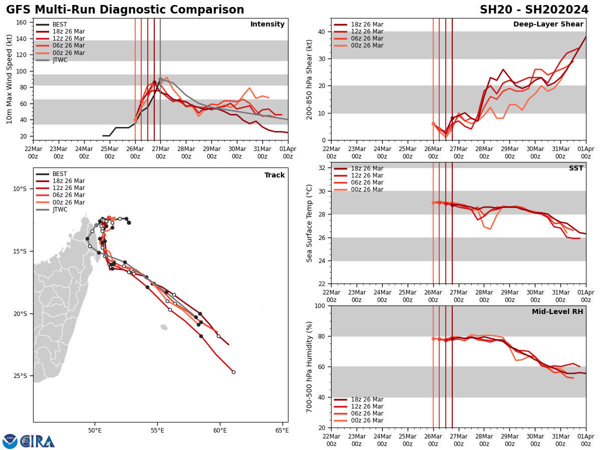 FORECAST REASONING. SIGNIFICANT FORECAST CHANGES: TC 20S HAS CONTINUED TO RAPIDLY INTENSIFY OVER THE LAST 12 HOURS, SO NEAR-TERM INTENSITIES ARE SET A BIT HIGHER THAN THE PREVIOUS FORECAST. FORECAST DISCUSSION: TC 20S IS FORECAST TO MAKE LANDFALL ON THE COAST OF MADAGASCAR WITHIN THE NEXT 12 HOURS AS IT REMAINS IN A COMPETING STEERING ENVIRONMENT. ONCE IT MAKES LANDFALL, THE SYSTEM IS ANTICIPATED TO ROUND THE WESTERN EDGE OF A NER TO THE EAST, INTERACTING WITH THE MOUNTAINOUS TERRAIN OF NORTHERN MADAGASCAR BEFORE BEGINNING TO CURVE TO THE SOUTHEAST BETWEEN TAU 24 AND 36, CONTINUING TO RIDE THE WESTERN PERIPHERY OF THE EASTERN NER. THE SYSTEM IS ANTICIPATED TO CONTINUE ON A SOUTHEASTERLY TRACK THROUGH THE END OF THE FORECAST PERIOD. PRIOR TO MAKING LANDFALL, THE SYSTEM IS EXPECTED TO REACH A PEAK INTENSITY ABOVE 90KTS BETWEEN TAU 0 AND TAU 12. ONCE TC 20S MAKES LANDFALL, MOIST INFLOW WILL BE RESTRICTED AND THE WESTERN PORTION OF THE SYSTEM WILL INTERACT WITH THE MOUNTAINOUS TOPOGRAPHY OF NORTHERN MADAGASCAR, INITIATING WEAKENING THROUGH THE FIRST 48 HOURS BEFORE THE SYSTEM COMES BACK OUT OVER WATER. VWS IS FORECAST TO INCREASE TO 20-25KTS BY THAT TIME, PREVENTING REINTENSIFICATION. THE SYSTEM WILL UNDERGO SUBTROPICAL TRANSITION AS IT INTERACTS WITH A CUTOFF LOW TO THE SOUTHWEST IN THE EXTENDED FORECAST PERIOD.