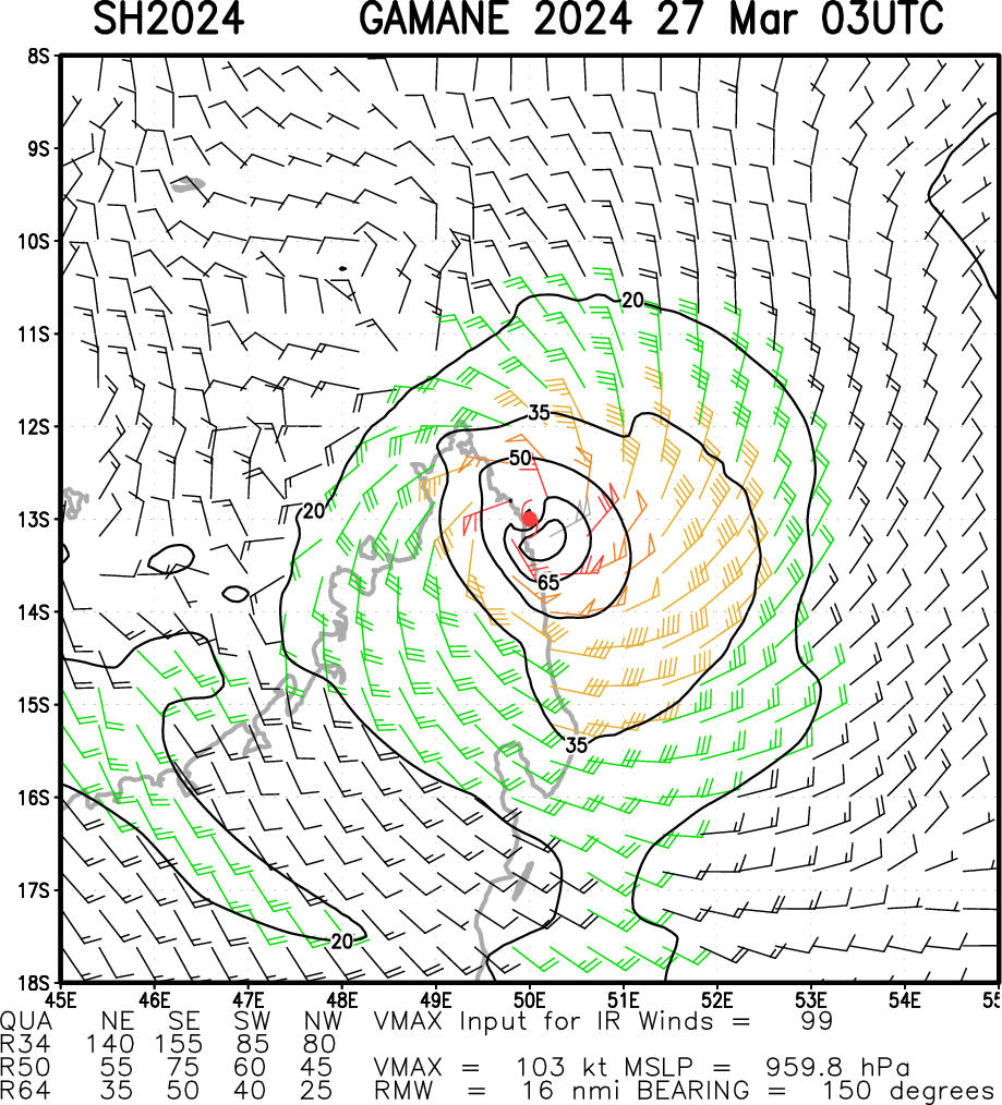 SOUTH INDIAN OCEAN: TC 20S(GAMANE). ESTIMATED LOCATION AND INTENSITY AT 27/00UTC. INTENSITY IS 90 KNOTS/CAT 2 US