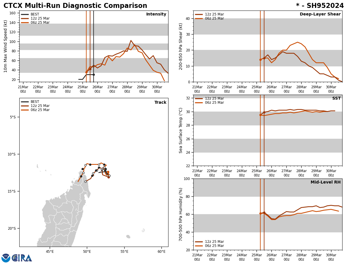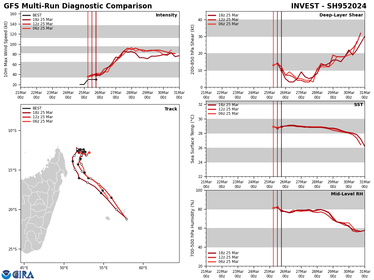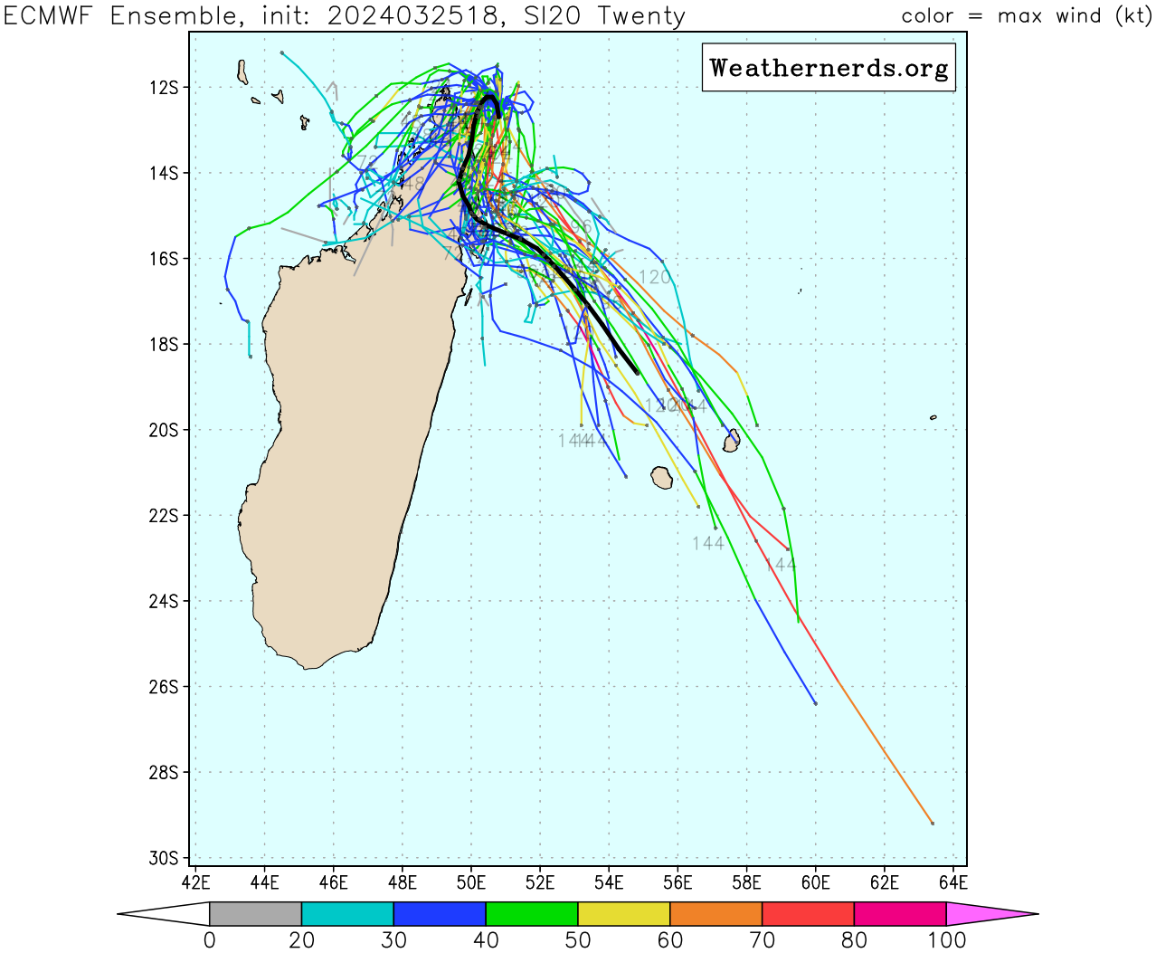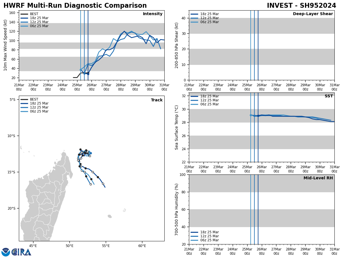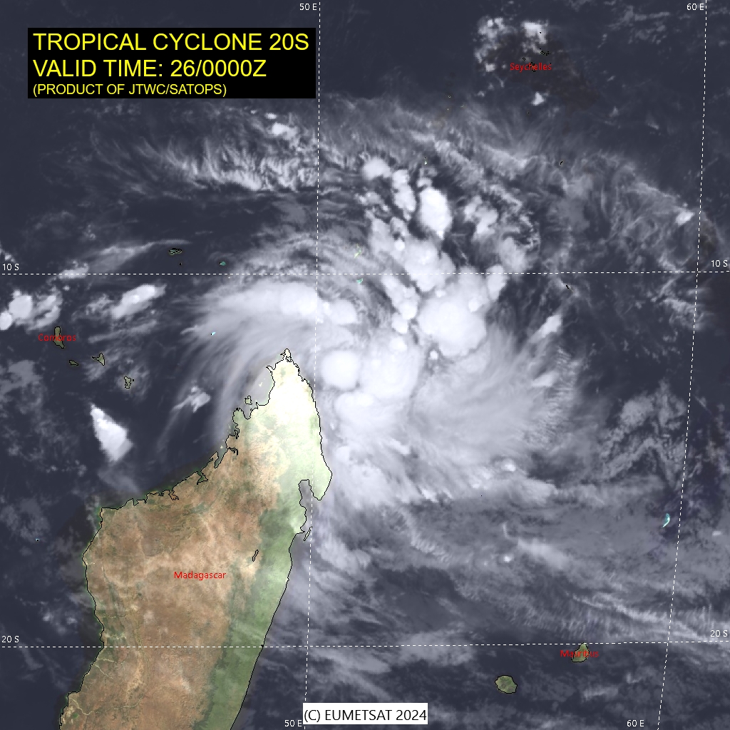 FORECAST REASONING. SIGNIFICANT FORECAST CHANGES: THIS INITIAL PROGNOSTIC REASONING MESSAGE ESTABLISHES THE FORECAST PHILOSOPHY. FORECAST DISCUSSION: TC 20S IS FORECAST TO REMAIN QS FOR THE NEXT 12 HOURS BEFORE BEGINNING TO SLOWLY CURVE TO THE SOUTH-SOUTHWEST AS IT ROUNDS THE WESTERN PERIPHERY OF THE NER TO THE EAST. FROM TAU 48-120, THE SYSTEM BEGINS TO CHANGE DIRECTION TO THE SOUTHEAST ON THE WESTERN PERIPHERY OF THE NER WHICH GRADUALLY MOVES EAST. AS THE SYSTEM TRAVELS SOUTH, IT IS EXPECTED TO BEGIN SUBTROPICAL TRANSITION AT TAU 120 DUE TO COOLER SSTS, INCREASED VWS, AND CLOSE PROXIMITY TO THE JET MAXIMUM. IN THE INTENSITY FORECAST, THERE IS A MODERATE LIKELIHOOD OF RAPID INTENSIFICATION (RI) TO 95KTS BETWEEN TAU 60-72 DUE TO CONSISTENTLY LOW VWS, STRONG DIVERGENCE ALOFT, AND FAVORABLE SSTS THROUGH TAU 60. THE PRIMARY MITIGATING FACTOR TO EVEN MORE SIGNIFICANT INTENSIFICATION IS THE PROXIMITY TO LAND OVER THE FIRST 36 HOURS, WHICH HAS THE POTENTIAL TO INTRODUCE DRY AIR FROM THE MOUNTAINOUS TERRAIN OF NORTHERN MADAGASCAR AND FRICTION FROM TOPOGRAPHY. AN INCREASE IN VWS TO 20-25KTS FROM TAU 72-120 IS EXPECTED TO CAUSE THE VORTEX TO SHALLOW AND BECOME EMBEDDED INTO A JET MAXIMUM AS THE SYSTEM TRAVELS SOUTH, DRASTICALLY REDUCING OUTFLOW AND ALLOWING FOR THE SYSTEM TO WEAKEN GRADUALLY.