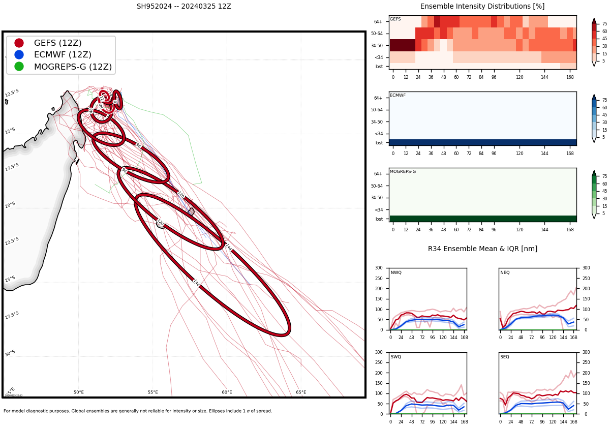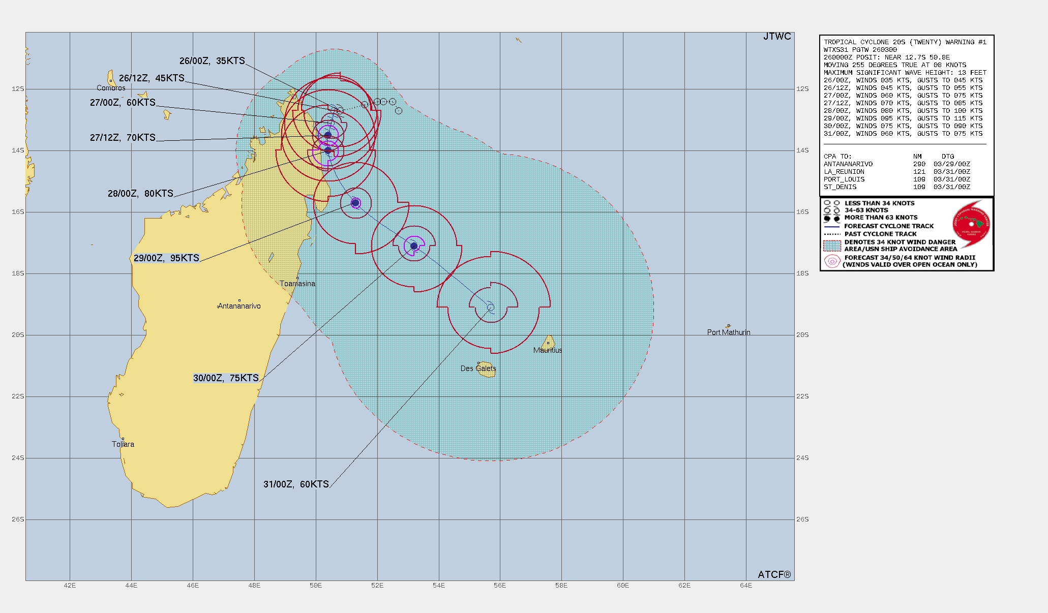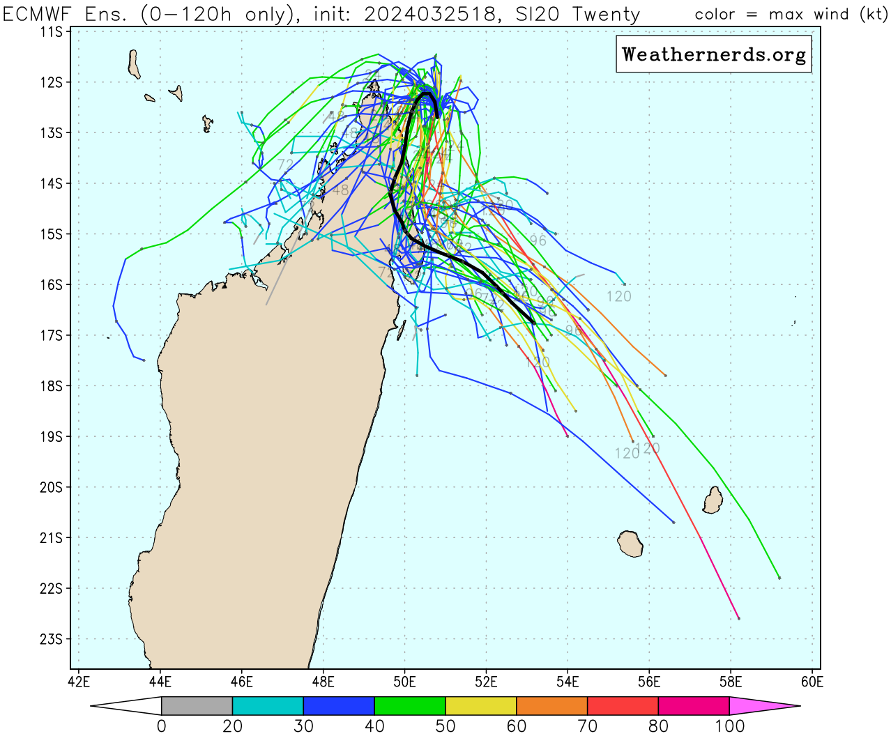 MODEL DISCUSSION: DETERMINISTIC MODEL GUIDANCE IS IN GOOD AGREEMENT IN THE NEAR TERM BUT CROSS-TRACK SPREAD BEGINS TO OPEN TO 250NM BY TAU 96. THERE BEGINS TO BE DEVIATIONS IN THE TRACK SPEED AT THAT SAME TIME, WITH GFS INCREASING TRACK SPEED RAPIDLY AND UKMET TAKING A MUCH SLOWER PATH LIKELY DUE TO DISAGREEMENT IN HOW SIGNIFICANTLY THE VORTEX WILL BE SHEARED AND SHALLOW BY THE END OF THE FORECAST PERIOD. THE INTENSITY GUIDANCE HAS A LARGE SPREAD BUT GENERALLY FORECASTS A PEAK BETWEEN 80-100KTS AT TAU 48. THE JTWC FORECAST PREDICTS A PEAK OF 95KTS BETWEEN TAU 60-72 DUE TO FAVORABLE OUTFLOW, SSTS, AND VWS. POTENTIAL INTERACTION FROM LAND ALSO WAS TAKEN INTO ACCOUNT EXPECTING THAT THE PEAK WILL OCCUR ONCE TC 20S MOVES AWAY FROM THE COAST OF MADAGASCAR.