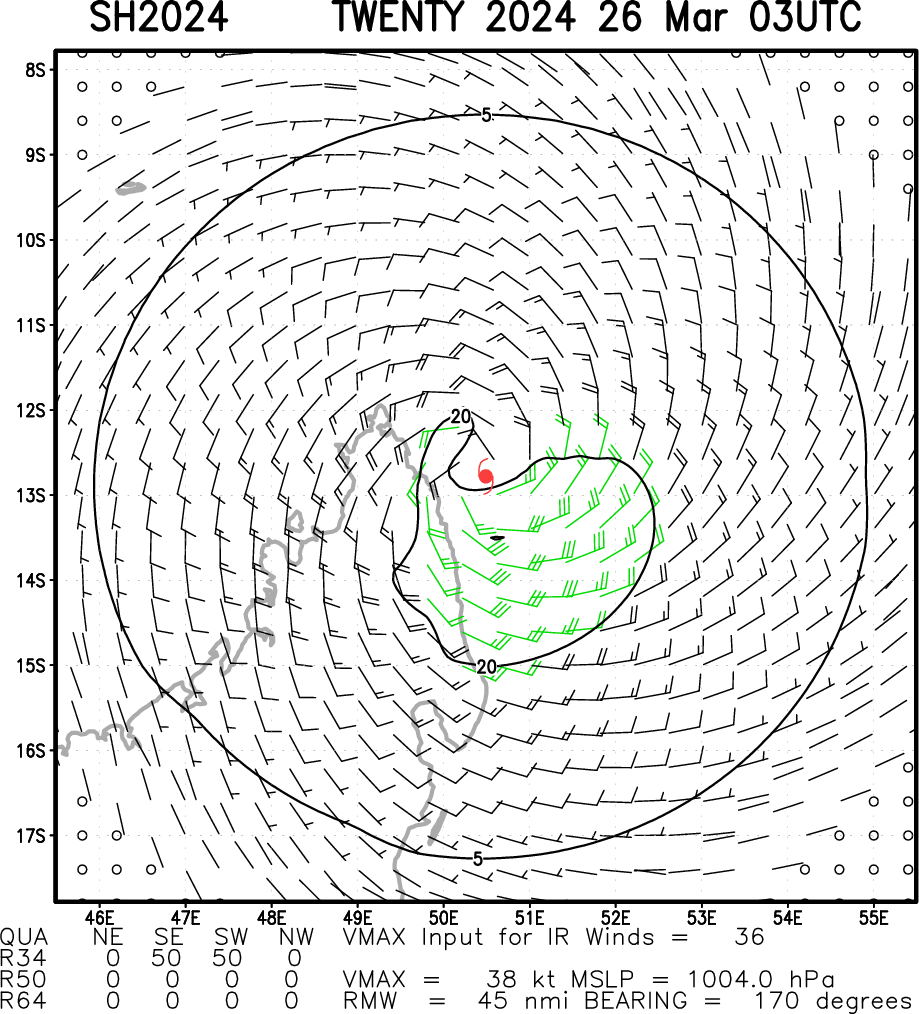 SOUTH INDIAN OCEAN: TC 20S. ESTIMATED LOCATION AND INTENSITY AT 26/00UTC. INTENSITY IS 35 KNOTS: + 15 KNOTS OVER 24 HOURS