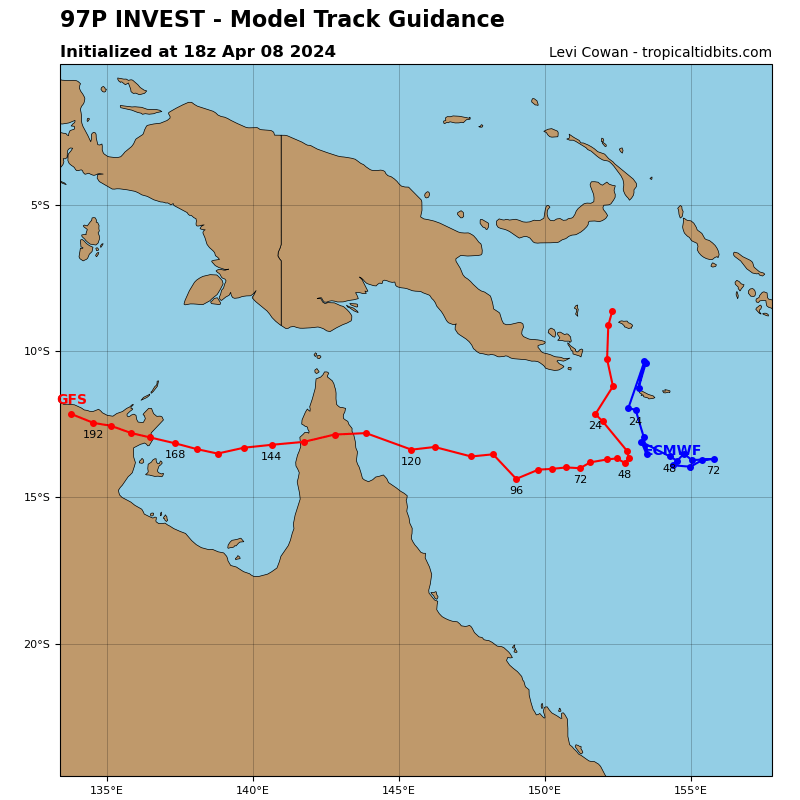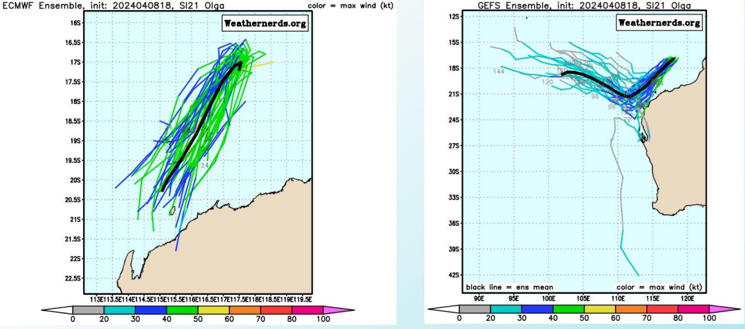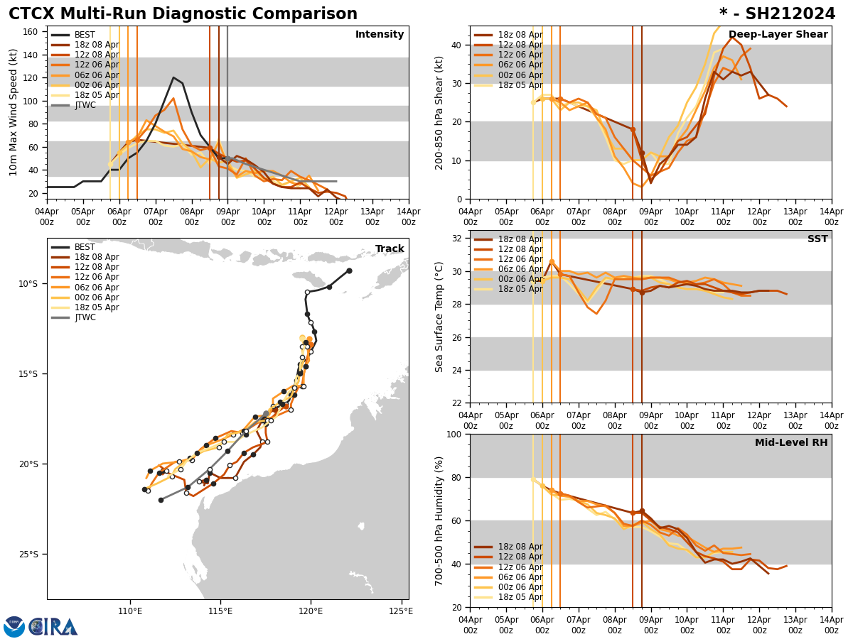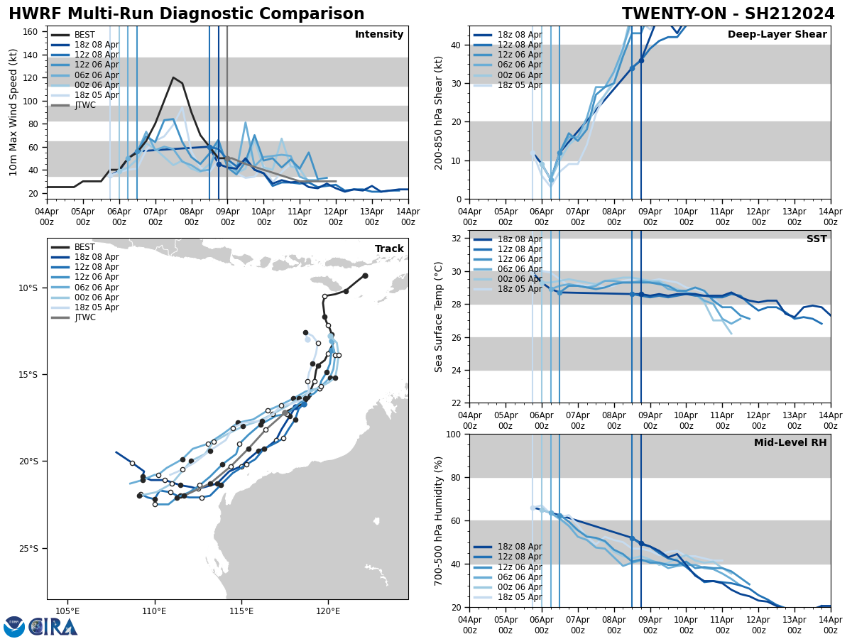 MODEL DISCUSSION: NUMERICAL MODEL GUIDANCE IS IN FAIR AGREEMENT WITH A 140 NM CROSS-TRACK SPREAD IN GUIDANCE AT TAU 72. GFS HAS SHIFTED TO BECOME THE EASTERNMOST MEMBER OF CONSENSUS, GRAZING THE EXMOUTH PENINSULA. THE CONSENSUS MEAN IS APPROXIMATELY 75 NM TO THE WEST. INTENSITY GUIDANCE CONTINUES TO AGREE WITH A WEAKENING TREND THROUGH THE FORECAST PERIOD. HAFS-A SUGGESTS A SLIGHTLY MORE GRADUAL DECREASE, WITH DISSIPATION AFTER TAU 72. OVERALL, THE JTWC INTENSITY FORECAST IS ASSESSED WITH MEDIUM CONFIDENCE.