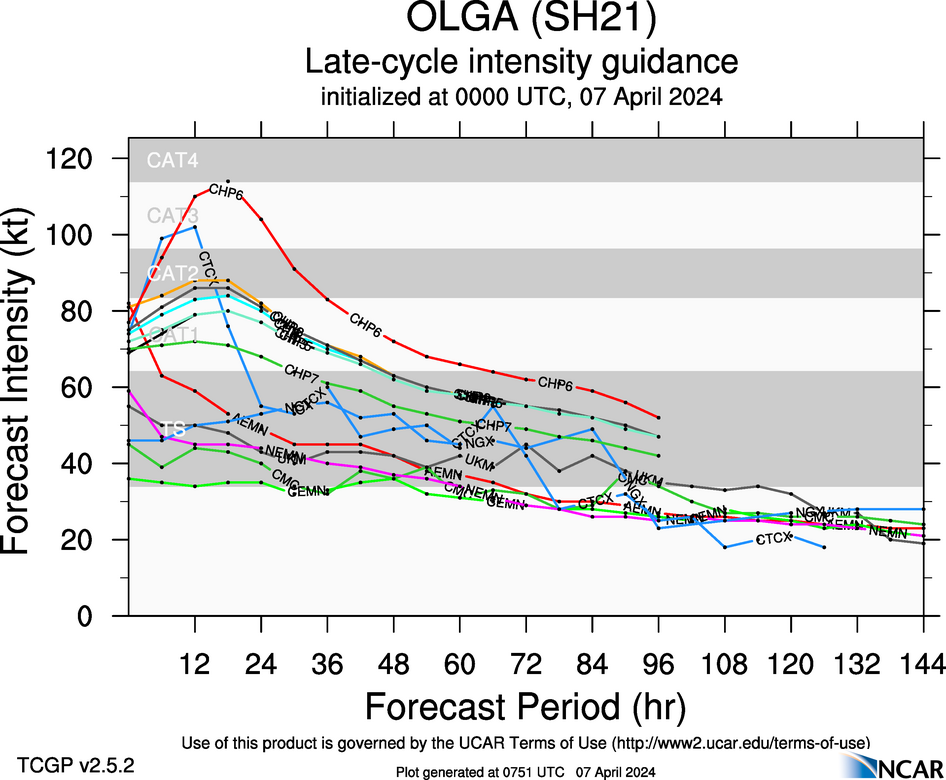 FORECAST REASONING. SIGNIFICANT FORECAST CHANGES: PEAK INTENSITY HAS BEEN INCREASED SIGNIFICANTLY FROM THE PREVIOUS FORECAST. FORECAST DISCUSSION: TC 21S WILL CONTINUE TRACKING SOUTHWESTWARD TO WEST-SOUTHWESTWARD ALONG THE NORTHWESTERN PERIPHERY OF THE STR THROUGH TAU 96 WHILE RAPIDLY WEAKENING. THE PEAK INTENSITY IS LIKELY OCCURRING NOW OR WITHIN THE NEXT SIX HOURS, WITH INCREASING NORTHWESTERLY VERTICAL WIND SHEAR OF 25 TO 35 KNOTS COMMENCING NEAR TAU 6 THROUGH TAU 12. ADDITIONALLY, SIGNIFICANT DRY AIR ENTRAINMENT WILL BEGIN TO ENVELOP THE SYSTEM WITHIN THE NEXT 12 HOURS. AFTER TAU 12, TC OLGA WILL WEAKEN RAPIDLY AS VWS INCREASES TO 35 TO 45 KNOTS THEN EVEN STRONGER (50 TO 70 KNOTS) VALUES AFTER TAU 48 AS THE SYSTEM TRACKS UNDER STRONG SUBTROPICAL WESTERLIES. AT THE SAME TIME, THE ENVIRONMENT WILL RAPIDLY TRANSITION TO VERY DRY CONDITIONS, WHICH WILL LEAD TO DISSIPATION NO LATER THAN TAU 96.