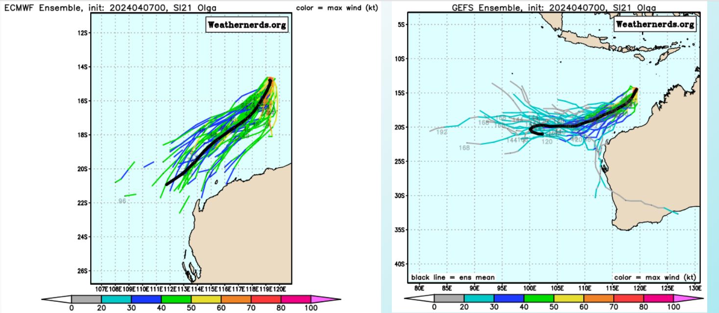 MODEL DISCUSSION: NAVGEM REMAINS THE SOLE OUTLIER, WITH A RECURVING TRACK INTO NORTHWESTERN AUSTRALIA. ANALYSIS OF THE NAVGEM FIELDS INDICATES THAT THIS ERRONEOUS, UNLIKELY SOUTHWARD TRACK IS A RESULT OF THE VERY LARGE SIZE OF THE SYSTEM (APPROXIMATELY 600 NM DIAMETER) DEPICTED IN THE MODEL. THE REMAINDER OF THE CONSENSUS TRACK GUIDANCE INDICATES A SOUTHWESTWARD TO WEST-SOUTHWESTWARD TRACK AND IS IN FAIR AGREEMENT, WITH A 140 NM TO 160 NM CROSS-TRACK SPREAD FROM TAU 72 TO TAU 96. THE 061800Z ECMWF ENSEMBLE (EPS) AND 070000Z GFS ENSEMBLE (GEFS) SUPPORT THE JTWC TRACK FORECAST WITH MEDIUM CONFIDENCE, WITH NO SOLUTIONS TRACKING THE SYSTEM OVER NORTHWESTERN AUSTRALIA. RELIABLE INTENSITY GUIDANCE SUPPORTS THE RAPID WEAKENING PHASE OF THE JTWC FORECAST AFTER TAU 12.