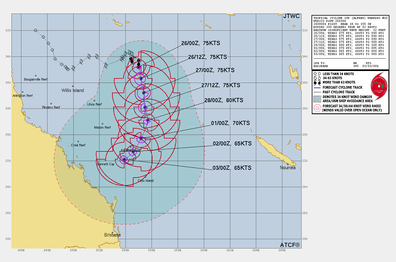 SOUTH PACIFIC OCEAN: TC 18P(ALFRED). 26/00UTC ESTIMATED INTENSITY IS 75 KNOTS CATEGORY 1 US. + 10 KNOTS OVER 24H.