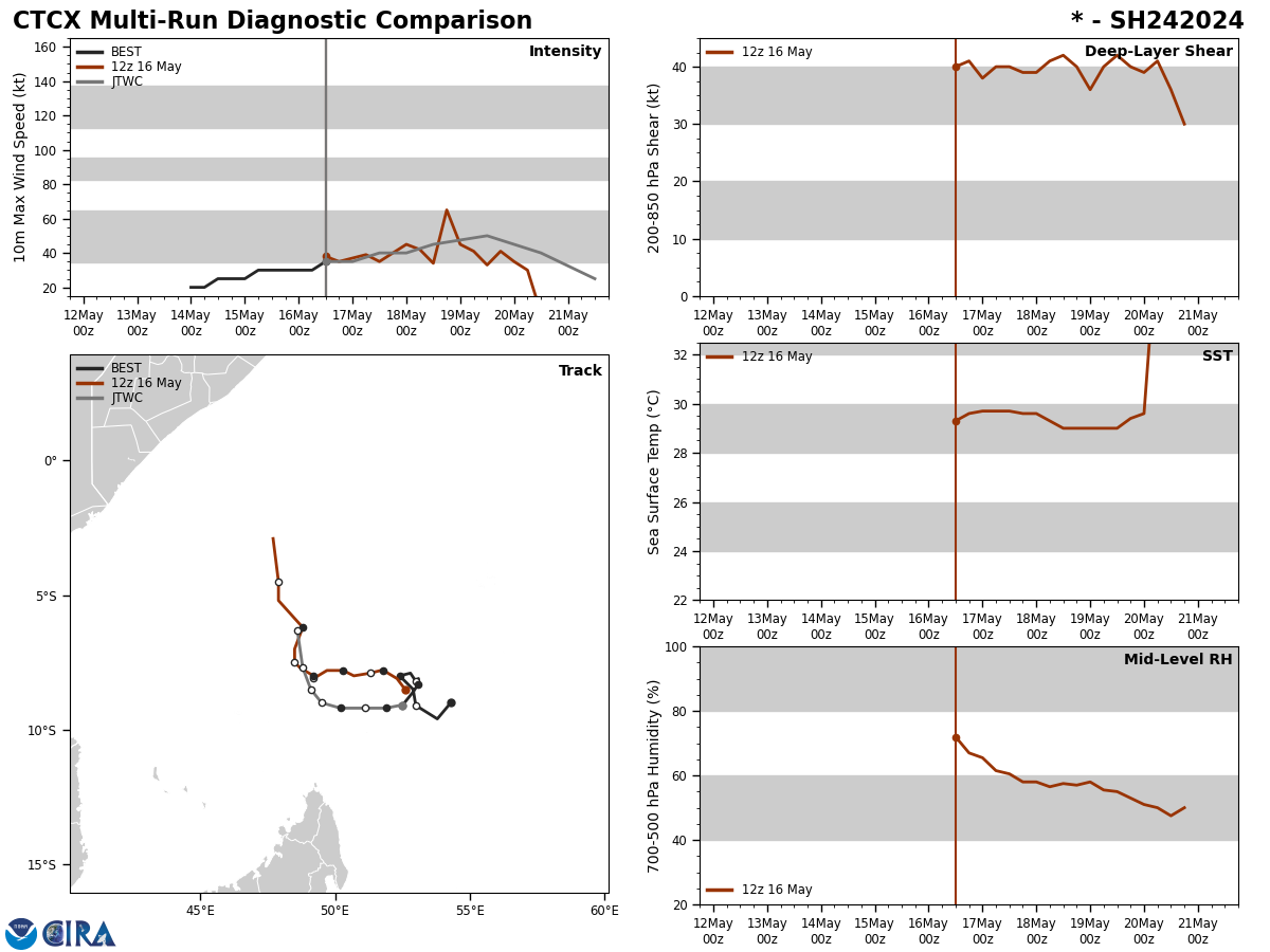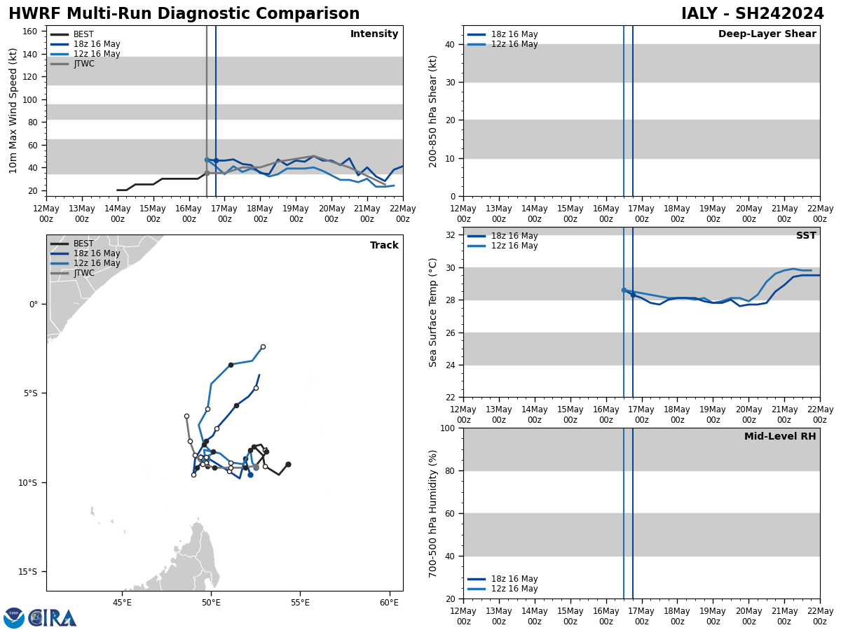 FORECAST REASONING. SIGNIFICANT FORECAST CHANGES: THERE ARE NO SIGNIFICANT CHANGES TO THE FORECAST FROM THE PREVIOUS WARNING. FORECAST DISCUSSION: TC 24S (IALY), IS FORECAST TO CONTINUE MEANDERING GENERALLY WESTWARD UNDER THE STEERING INFLUENCE OF THE STR TO THE SOUTH. AS THE SYSTEM PROPAGATES WESTWARD, MODERATE VERTICAL WIND SHEAR (VWS) AND MID-LEVEL DRY AIR ENTRAINMENT WILL GENERALLY NEGATE WARM SSTS AND FAVORABLE UPPER-LEVEL OUTFLOW, RESULTING IN STAGNATING INTENSITIES THROUGH TAU 24. AS THE STR TO THE SOUTH REORIENTS AND BREAKS DOWN, STEERING INFLUENCE SHIFTS TO A BUILDING NEAR-EQUATORIAL RIDGE (NER) TO THE WEST. AS THIS SHIFTS TAKES PLACE AND THE SYSTEM IS DEFLECTED EQUATORWARD, MOMENTARILY LOWER VWS VALUES AND INCREASED UPPER-LEVEL OUTFLOW WILL RESULT IN LIMITED INTENSIFICATION TO AROUND 45KTS AND POSSIBLY 50KTS BY TAU 48. BY TAU 72, THE PARTY IS OVER, AS VWS, DRY AIR ENTRAINMENT AND HEAVILY REDUCED OUTFLOW RESULTS IN STEADY WEAKENING THROUGH DISSIPATION NEAR TAU 120 AS THE SYSTEM ACCELERATES EQUATORWARD.