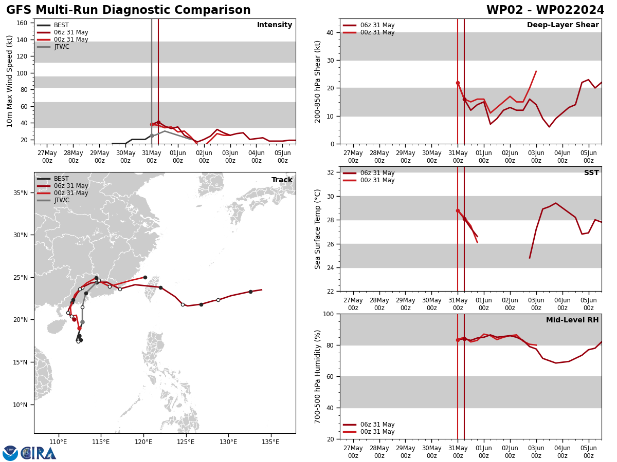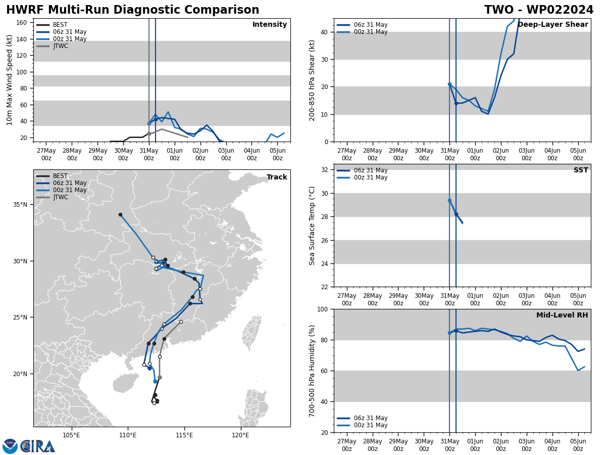 MODEL DISCUSSION: DETERMINISTIC AND ENSEMBLE TRACK GUIDANCE IS IN GOOD AGREEMENT THAT THE SYSTEM WILL TRACK GENERALLY NORTHWARD, AND TURN NORTHEASTWARD AFTER MOVING INLAND. AS MENTIONED ABOVE, SOME OF THE GLOBAL MODEL FIELDS, GFS IN PARTICULAR, SUGGEST THE LOW-LEVEL VORTEX WILL STALL ALONG THE COASTLINE AS IT RUNS INTO THE HIGHER TERRAIN. BUT OVERALL, THE BULK OF THE MODELS ARE IN AGREEMENT THAT THE VORTEX WILL CONTINUE ON ITS MERRY WAY INTO SOUTHERN CHINA. THE JTWC TRACK FORECAST LIES ON THE NORTHERN EDGE OF THE GUIDANCE ENVELOPE WITH MEDIUM CONFIDENCE. INTENSITY GUIDANCE IS IN GOOD AGREEMENT ON RAPID WEAKENING AFTER LANDFALL, THOUGH THE HWRF CONTINUES TO SHOW A SHARP SPIKE UP TO NEAR 40 KNOTS PRIOR TO LANDFALL. THE JTWC FORECAST IS CONSISTENT WITH THE CONSENSUS MEAN WITH MEDIUM CONFIDENCE.