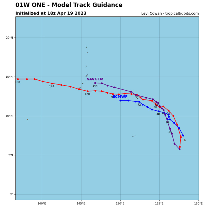 FORECAST REASONING. SIGNIFICANT FORECAST CHANGES: THE FORECAST TRACK IS SHIFTED NORTHWARD FROM THE PREVIOUS WARNING BASED ON A RELOCATION OF THE PREVIOUS STORM POSITION APPROXIMATELY 70 NM TO THE NORTH. HOWEVER, THE OVERALL FORECAST PHILOSOPHY HAS NOT CHANGED FROM THE PREVIOUS WARNING. FORECAST DISCUSSION: TS 01W WILL TURN FROM A NORTHWESTWARD TO A GENERALLY WESTWARD TRACK OVER THE NEXT 24 TO 36 HOURS AS THE PRIMARY STEERING INFLUENCE TRANSITIONS FROM LOW- TO MID-LAYER RIDGING TO THE NORTHEAST TO A BUILDING SUBTROPICAL RIDGE TO THE NORTH. ENVIRONMENTAL CONDITIONS INCLUDING LOW VERTICAL WIND SHEAR, HIGH SST, AND RADIAL OUTFLOW ALOFT WILL CONTINUE TO SUPPORT STEADY INTENSIFICATION. HOWEVER, THE SYSTEM IS EXPECTED TO TRACK INTO AN AREA OF INCREASING SOUTHWESTERLY VERTICAL WIND SHEAR AND INGEST A DRIER SUBTROPICAL AIR MASS FROM TAU 24 ONWARD. DISSIPATION TO BELOW THE WARNING THRESHOLD INTENSITY OF 25 KNOTS BY TAU 96 IS ANTICIPATED UNDER THESE INCREASINGLY UNFAVORABLE CONDITIONS.