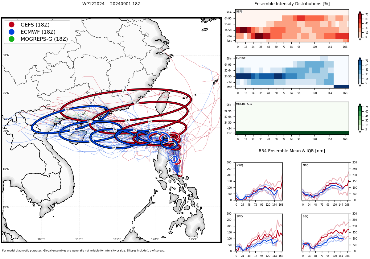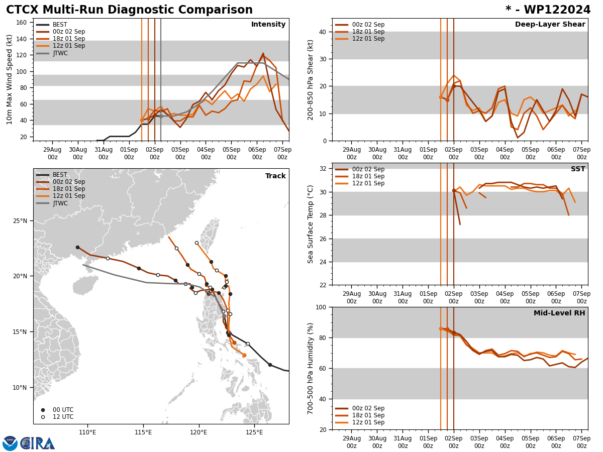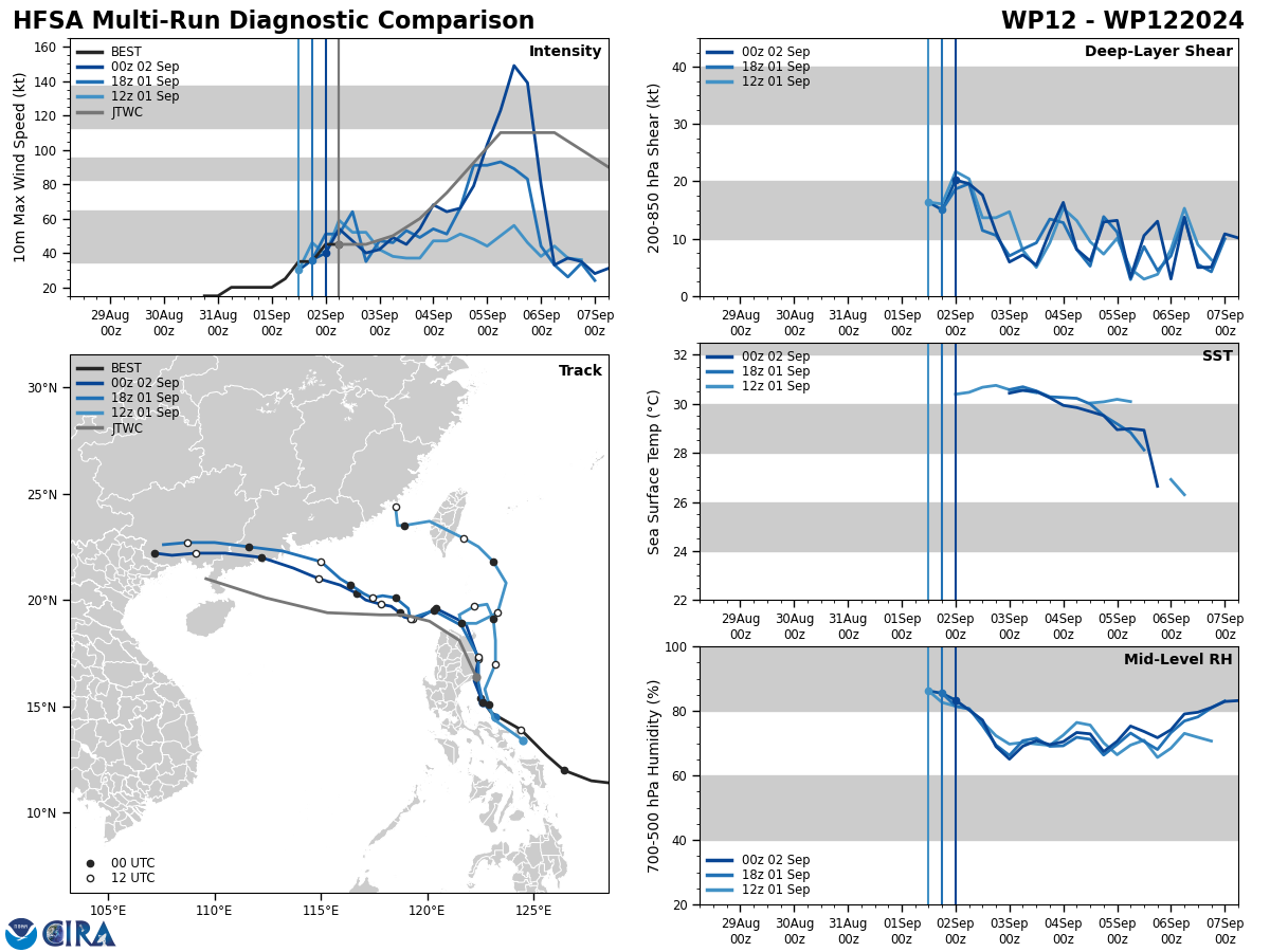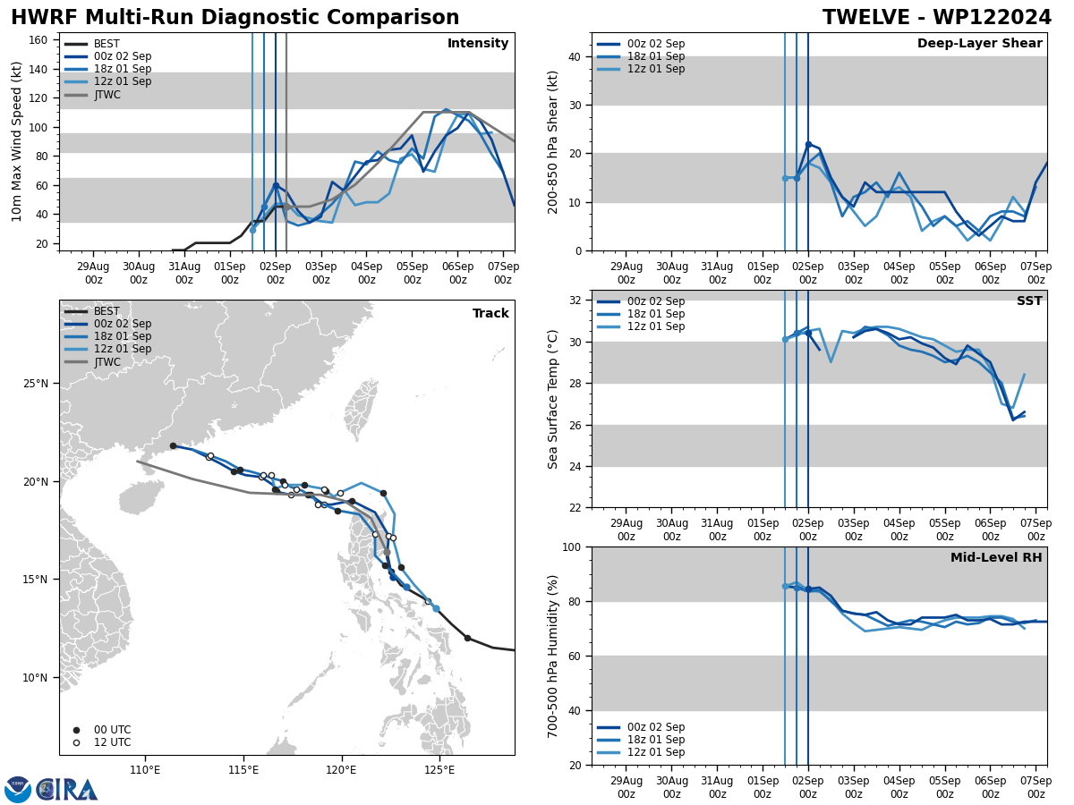 MODEL DISCUSSION: MESOSCALE MODEL GUIDANCE (HAFS-A AND HWRF) CARRIES A TRACK SIMILAR TO THE JTWC FORECAST, WHICH SLOWS TS 12W AFTER ITS EMERGENCE INTO THE SOUTH CHINA SEA, WHERE POSSIBLE RI COULD OCCUR. THE PEAK INTENSITY FROM HAFS-A AND HWRF OCCURS NEAR TAU 72, WHEREAS GLOBAL MODELS MAINTAIN A SLIGHTLY FASTER TRACK AND ARE SPLIT BETWEEN A TAU 72 AND A TAU 96 PEAK INTENSITY. THE BULK OF THE TRACK GUIDANCE HAS COME INTO BETTER AGREEMENT CONCERNING THE WESTWARD TRACK ACROSS THE SOUTH CHINA SEA AFTER TS 12W EITHER BENDS AROUND THE NE SIDE OR SHALLOWS ITS WESTWARD TURN AND TRACKS ACROSS LUZON. AT TAU 48, THERE IS A 48 NM CROSS-TRACK SPREAD OF THE RELIABLE MODEL GUIDANCE. THE GFS ENSEMBLE (GEFS) SUPPORTS THE WESTWARD TRACK BEYOND TAU 24 WITH ABOUT 70 PERCENT AGREEMENT, AND THE ECMWF ENSEMBLE (EPS) PRESENTS A MUCH TIGHTER AGREEMENT SUPPORTING THE JTWC TRACK WITH MEDIUM CONFIDENCE.