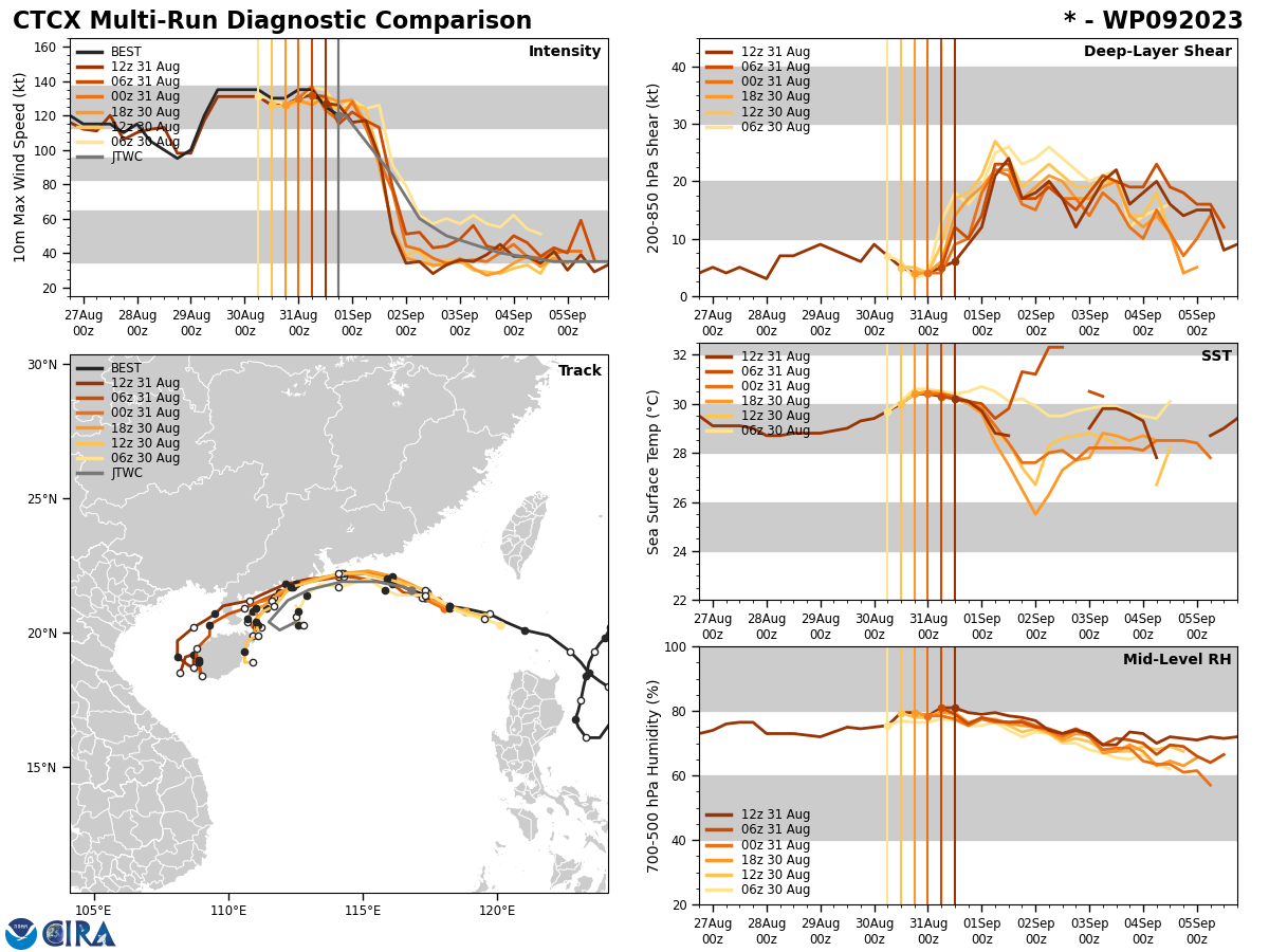 MODEL DISCUSSION: WITH THE EXCEPTION OF THE UKMET ENSEMBLE MEAN (UEMN), WHICH LOOPS THE SYSTEM SOUTH OF HONG KONG, NUMERICAL MODEL GUIDANCE IS IN FAIR AGREEMENT THROUGH TAU 36 WITH A 45 NM CROSS-TRACK SPREAD IN SOLUTIONS AT TAU 36. AFTER TAU 36, GUIDANCE DIVERGES WITH SIGNIFICANT DIFFERENCES IN THE DEGREE AND TIMING OF THE EASTWARD TURN. DUE TO THE LARGE DEGREE OF UNCERTAINTY, THERE IS MEDIUM OVERALL CONFIDENCE IN THE JTWC TRACK FORECAST THROUGH TAU 120. THE 311200Z ECMWF ENSEMBLE ALSO INDICATES SIGNIFICANT UNCERTAINTY IN THE TIMING OF THE EASTWARD TURN, POSSIBLY AS FAR WEST AS THE GULF OF TONKIN. THE 311800Z GFS ENSEMBLE SHOWS THE BULK OF THE SOLUTIONS TURNING THE SYSTEM OVER OR TO THE EAST OF HAINAN ISLAND. RELIABLE INTENSITY GUIDANCE IS IN FAIR AGREEMENT THROUGH TAU 120 LENDING MEDIUM CONFIDENCE TO THE JTWC INTENSITY FORECAST.