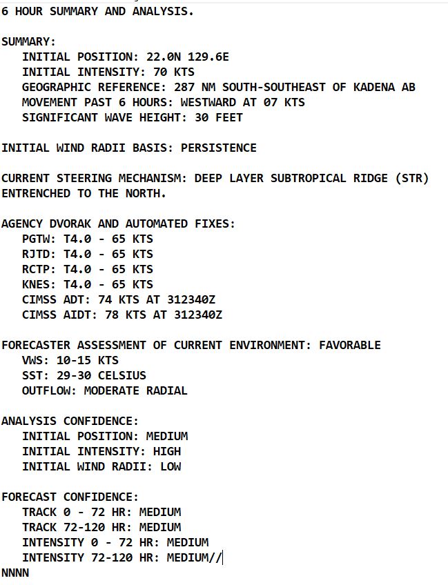 SATELLITE ANALYSIS, INITIAL POSITION AND INTENSITY DISCUSSION: ANIMATED ENHANCED INFRARED (EIR) SATELLITE IMAGERY DEPICTS A CONSOLIDATING SYSTEM WITH DEEP CONVECTIVE BANDING WRAPPING INTO A DEFINED LOW-LEVEL CIRCULATION CENTER (LLCC). A 312127Z SSMIS 91 GHZ COLOR COMPOSITE MICROWAVE IMAGE REVEALS IMPROVED CONVECTIVE STRUCTURE WITH SPIRAL BANDING WRAPPING TIGHTLY INTO A DEFINED MICROWAVE EYE FEATURE. THE INITIAL POSITION IS PLACED WITH MEDIUM CONFIDENCE BASED ON THE SSMIS IMAGE. ANIMATED WATER VAPOR IMAGERY INDICATES IMPROVING RADIAL OUTFLOW, ESPECIALLY OVER THE NORTHERN SEMICIRCLE. THE INITIAL INTENSITY OF 70 KTS IS ASSESSED WITH MEDIUM CONFIDENCE BASED ON A BLEND OF THE AGENCY DVORAK ESTIMATES AND CIMSS ADT, AIDT ESTIMATES.