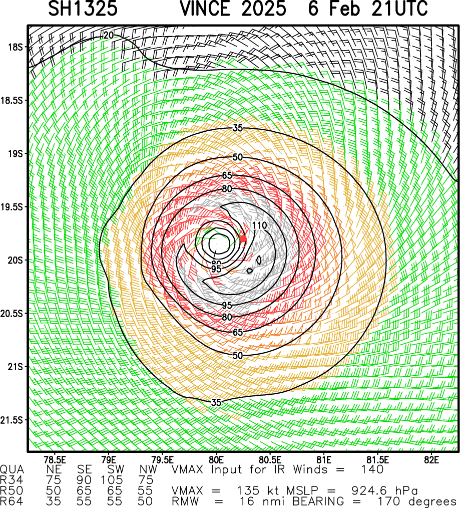 SOUTH INDIAN OCEAN: TC 13S(VINCE). 06/18UTC ESTIMATED INTENSITY IS 135 KNOTS/ CATEGORY 4 US(SUPER TYPHOON): + 30 KNOTS OVER 24 HOURS