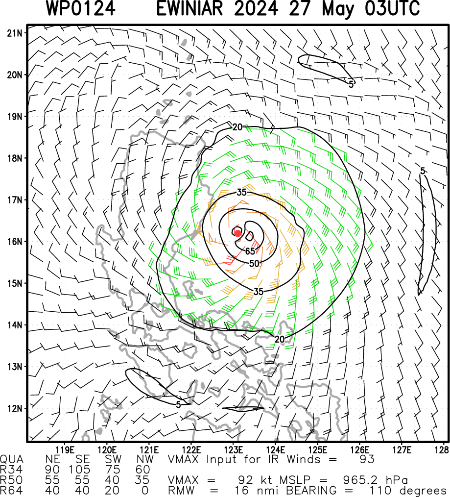SATELLITE ANALYSIS, INITIAL POSITION AND INTENSITY DISCUSSION: ANIMATED MULTISPECTRAL SATELLITE IMAGERY (MSI) DEPICTS TYPHOON (TY) 01W (EWINIAR) EXHIBITING A FURTHER CONSOLIDATING STRUCTURE, WITH DEEP CONVECTIVE BANDING PREVALENT MOSTLY IN THE NORTHEASTERN QUADRANT. THE INITIAL POSITION IS PLACED WITH HIGH CONFIDENCE BASED ON A 270000Z HIMAWARI 1KM VISIBLE SATELLITE IMAGE. IN ANIMATED IMAGERY, THE ONCE EVIDENT PINHOLE EYE FEATURE HAS OBSCURED, PRESENTING A DIMPLE IN THE CIRRUS CANOPY OVERHEAD OF THE LLCC. THE OVERALL ENVIRONMENT IS ASSESSED AS HIGHLY FAVORABLE, WITH PERSISTING POLEWARD OUTFLOW ALOFT, VERY WARM (30-31C) SEA SURFACE TEMPERATURES, AND LOW (5-10 KTS) VERTICAL WIND SHEAR. THE INITIAL INTENSITY OF 90 KTS IS ASSESSED WITH MEDIUM CONFIDENCE BASED ON SUBJECTIVE AND OBJECTIVE INTENSITY ESTIMATES LISTED BELOW.