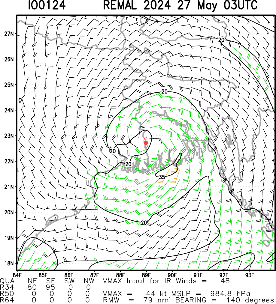 NORTH INDIAN OCEAN/OVER-LAND: TC 01B(REMAL).ESTIMATED LOCATION AND INTENSITY AT 27/00UTC.ESTIMATED PEAK INTENSITY WAS 55 KNOTS.