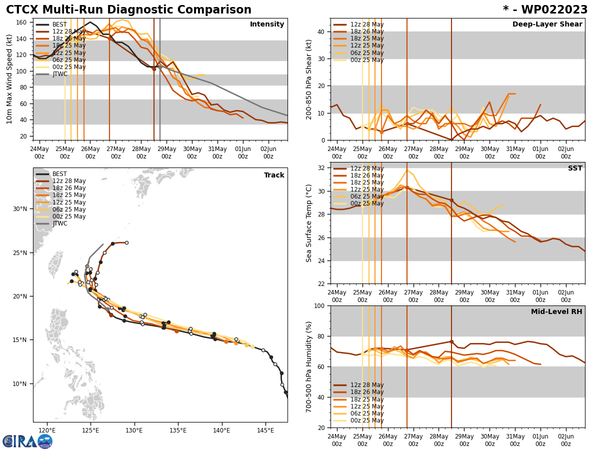 FORECAST REASONING. SIGNIFICANT FORECAST CHANGES: THERE ARE NO SIGNIFICANT CHANGES TO THE FORECAST FROM THE PREVIOUS WARNING. FORECAST DISCUSSION: TY 02W IS TRACKING NORTHWEST AS IT RIDES THE SOUTHWESTERN PERIPHERY OF THE STR TO THE NORTHEAST. THROUGH TAU 36, TY MAWAR WILL STAY ALONG THIS TRAJECTORY AND STEADILY WEAKEN TO 90 KNOTS AS IT ENTERS A HOSTILE ENVIRONMENT FOR CONTINUED TROPICAL ACTIVITY. IN ADDITION, THE SYSTEM WILL SLOW DOWN IN TRACK SPEED AND TURN NORTHWARD AS THE STEERING ENVIRONMENT SHIFTS FROM THE STR TO THE NORTHEAST TO A RIDGE THAT WILL BUILD IN FROM OVER CHINA TO THE NORTHWEST. BY TAU 48 THROUGH TAU 72, THERE IS THE POSSIBILITY THE SYSTEM WILL HAVE A QUASI-STATIONARY POSTURE AS THESE TWO RIDGES ORIENTATE THEMSELVES. BY TAU 72 AND BEYOND, THE STR TO THE NORTHWEST WILL BE THE DOMINANT STEERING MECHANISM AND WILL DRIVE TY MAWAR NORTHEASTWARD. ALL THE WHILE, THE INTENSITY WILL CONTINUE TO DECREASE TO 45 KNOTS BY THE END OF THE FORECAST PERIOD DUE TO THE COOLER (25-26C) SSTS ABOVE THE 20TH PARALLEL, AS WELL AS THE UPWELLING CAUSED BY THE SYSTEM DURING ITS ANTICIPATED SLOW DOWN IN TRACK SPEED.