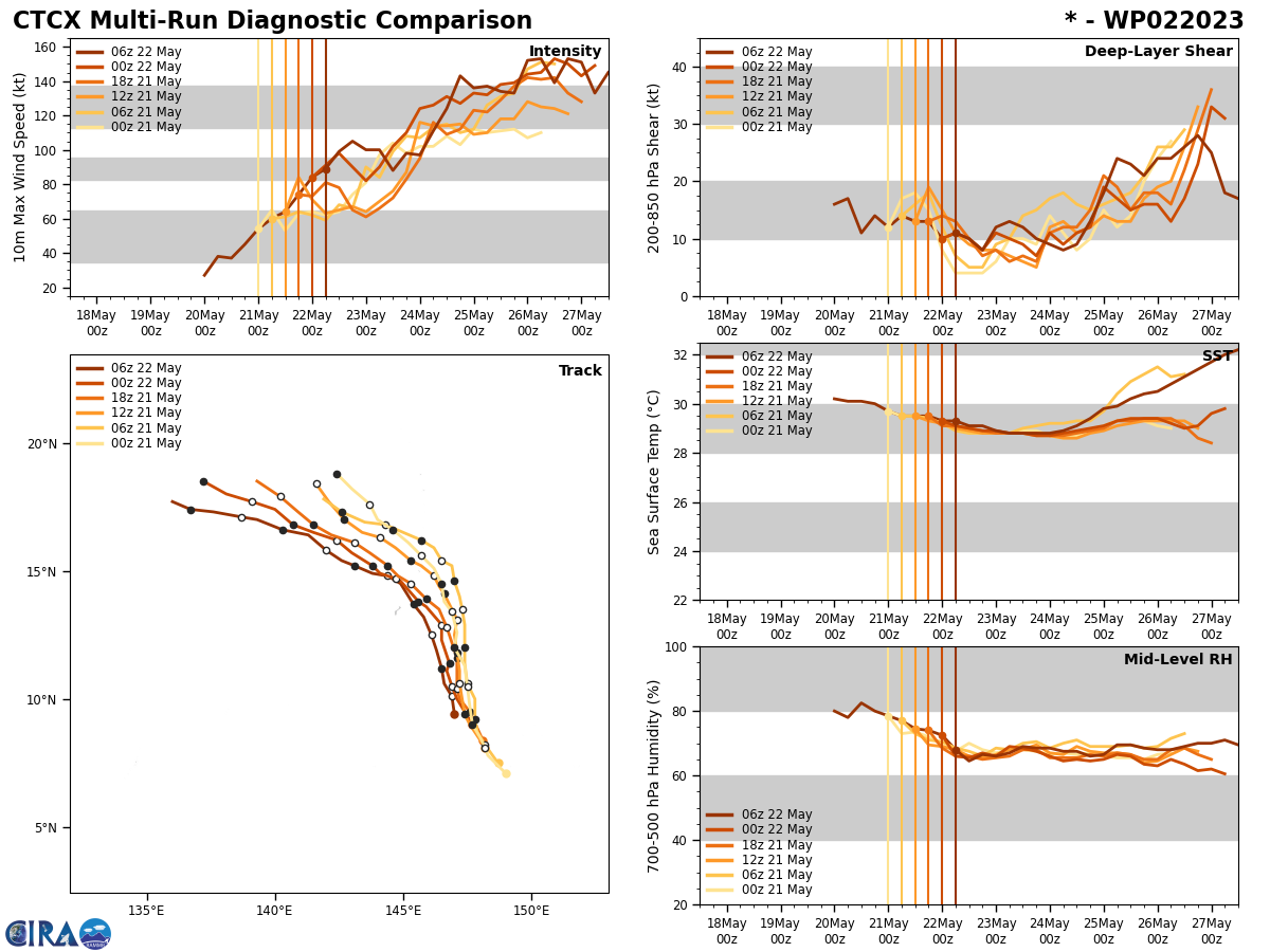 FORECAST REASONING. SIGNIFICANT FORECAST CHANGES: THERE ARE NO SIGNIFICANT CHANGES TO THE FORECAST FROM THE PREVIOUS WARNING. FORECAST DISCUSSION: TY 02W (MAWAR) IS FORECAST TO CONTINUE TRACKING GENERALLY WEST-NORTHWESTWARD UNDER THE STEERING INFLUENCE OF THE NER RIDGE TO THE EAST. 02W IS FORECAST TO REMAIN IN A FAVORABLE ENVIRONMENT CHARACTERIZED BY VIGOROUS UPPER LEVEL OUTFLOW AND WARM SEA SURFACE TEMPERATURES OFFSET SLIGHTLY BY LOW-MODERATE VERTICAL WIND SHEAR (VWS). AS 02W CONTINUES TO DEVELOP AND INTENSIFY, THE SYSTEM WILL COCOON ITSELF IN A MOISTURE POCKET AND GENERALLY SHRUG OFF THE DRY AIR BEING FUNNELED EQUATORWARD BY THE STR TO THE WEST. THESE ELEMENTS WILL STRENGTHEN THE SYSTEM TO AROUND 105KTS BY TAU 36. AROUND THE SAME TIME, THE NER TO THE EAST WILL REORIENT AND SHIFT POLEWARD, FORCING 02W TO ALTER COURSE AND STEADY UP ON A WEST-NORTHWESTWARD HEADING. AFTER PASSING EQUATORWARD OF GUAM, 02W WILL CONTINUE INTO THE PHILIPPINE SEA WITH PLENTY OF DEEP OCEAN HEAT CONTENT (OHC) TO CONTINUE GAINING STRENGTH AND EVENTUALLY REACH A PEAK INTENSITY OF 125KTS BY TAU 120, WHICH IS JUST SHORT OF SUPER-TYPHOON STRENGTH.