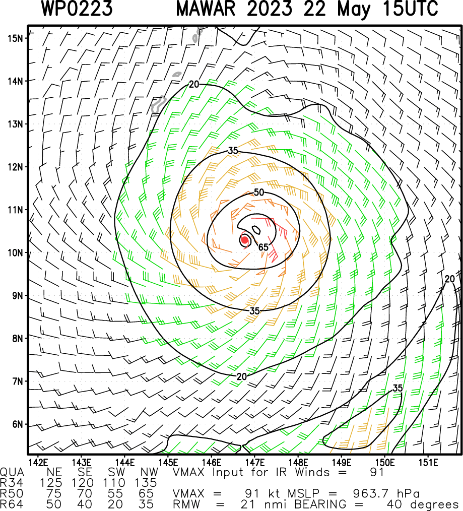 WESTERN NORTH PACIFIC: TY 02W(MAWAR). CURRENT ESTIMATED INTENSITY IS 90 KNOTS(CAT 2 US) AT 22/12UTC: +30 KNOTS OVER 24HOURS.