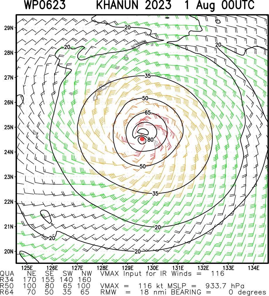 FORECAST REASONING. SIGNIFICANT FORECAST CHANGES: THERE ARE NO SIGNIFICANT CHANGES TO THE FORECAST FROM THE PREVIOUS WARNING. FORECAST DISCUSSION: TY KHANUN HAS STARTED TO BEND ONTO A MORE WEST-NORTHWESTWARD TRACK NOW THAT THE PRIMARY STEERING MECHANISM HAS SHIFTED OVER TO THE DEEP-LAYER STR TO THE NORTH. THIS GENERAL MOTION IS EXPECTED TO CONTINUE THROUGH THE FIRST 48 HOURS OF THE FORECAST, THOUGH TRACK SPEEDS ARE EXPECTED TO BEGIN TO SLOW DOWN AFTER TAU 24 AS THE UPPER-LEVEL STEERING PATTERN BEGINS TO WEAKEN. AFTER ROUGHLY TAU 36, THE STR TO THE NORTH WILL SLIDE TO THE SOUTHWEST, WHILE SIMULTANEOUSLY A NEAR EQUATORIAL RIDGE (NER) BUILDS IN TO THE SOUTHEAST AND THE STR TO THE EAST REMAINS FIRMLY ENTRENCHED TO THE EAST OF JAPAN, TRAPPING TY 06W IN THE MIDDLE OF A WEAK AND COMPETING STEERING PATTERN. AS A RESULT, BY TAU 48, TY 06W WILL BECOME QUASI-STATIONARY AND MEANDERING ERRATICALLY IN THE CENTRAL PORTION OF THE EAST CHINA SEA. BY TAU 96 THE SYSTEM WILL BEGIN TO SLOWLY TRACK NORTHEASTWARD AS THE NER TO THE SOUTH ASSUMES THE DOMINATE STEERING ROLE. WHILE THE FORECAST TRACK CALLS FOR A TURN TO THE NORTHEAST, IT MUST BE REITERATED THAT TRACK SPEEDS ARE VERY LOW, LESS THAN 3 KNOTS FOR THE BULK OF FORECAST AFTER TAU 48, AND ERRATIC AND HIGHLY UNCERTAIN TRACK MOTIONS SHOULD BE ANTICIPATED. TY 06W HAS LIKELY REACHED PEAK INTENSITY AND IS EXPECTED TO MAINTAIN ITS CURRENTLY INTENSITY FOR THE NEXT 6 TO 12 HOURS AS IT PASSES TO THE SOUTHWEST OF OKINAWA. AFTER PASSING OKINAWA THE SYSTEM WILL BEGIN A GRADUAL WEAKENING TREND DUE TO REDUCED OUTFLOW ALOFT, PERSISTENT DRY AIR INTRUSION FROM THE NORTH AND A MODEST INCREASE IN SHEAR. AS THE SYSTEM BECOMES QUASI-STATIONARY AROUND TAU 48, THE SYSTEM GENERATE SIGNIFICANT UPWELLING, WITH THE HAFS-A DEPICTING SST REDUCTIONS ON THE ORDER OF 4C OR MORE IN THE EAST CHINA SEA, LEADING TO A RAPID WEAKENING TREND AFTER TAU 48.