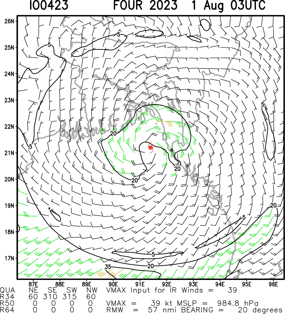 SATELLITE ANALYSIS, INITIAL POSITION AND INTENSITY DISCUSSION: ANIMATED MULTISPECTRAL SATELLITE IMAGERY (MSI) DEPICTS AN EXPOSED LOW LEVEL CIRCULATION CENTER (LLCC) WITH SPOTTY CONVECTION FLARING UP ON THE WESTERN AND SOUTHERN SIDES OF THE CIRCULATION. ANIMATED RADAR DATA FROM BANGLADESH SHOWS THE LLCC TO GOOD EFFECT, AND COMBINED WITH THE MSI IMAGERY, PROVIDED HIGH CONFIDENCE TO THE INITIAL POSITION. THE INITIAL INTENSITY REMAINS SET AT 40 KNOTS WITH MEDIUM CONFIDENCE, HEDGED SLIGHTLY HIGHER THAN THE AGENCY DVORAK INTENSITY ESTIMATES OF T2.0 (30 KNOTS) FROM BOTH PGTW AND KNES, IN PERSISTENCE WITH EARLIER SCATTEROMETER DATA. CIMSS ANALYSIS REVEALS A SIGNIFICANT INCREASE IN NORTHEASTERLY SHEAR, NOW UP TO 25-30 KNOTS, BUT THE UPPER-LEVEL FLOW REMAINS DIVERGENT IN THE VICINITY OF THE CIRCULATION, PROVIDING SOME EXHAUST FOR THE FLARING CONVECTION. OUTSIDE OF THE SHEAR, THE ENVIRONMENT REMAINS SUPPORTIVE, WITH VERY WARM SSTS AND ROBUST EQUATORWARD OUTFLOW.