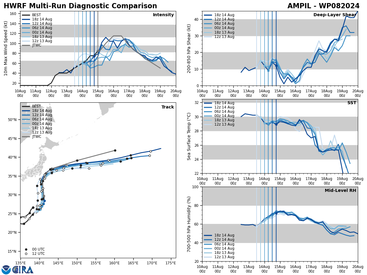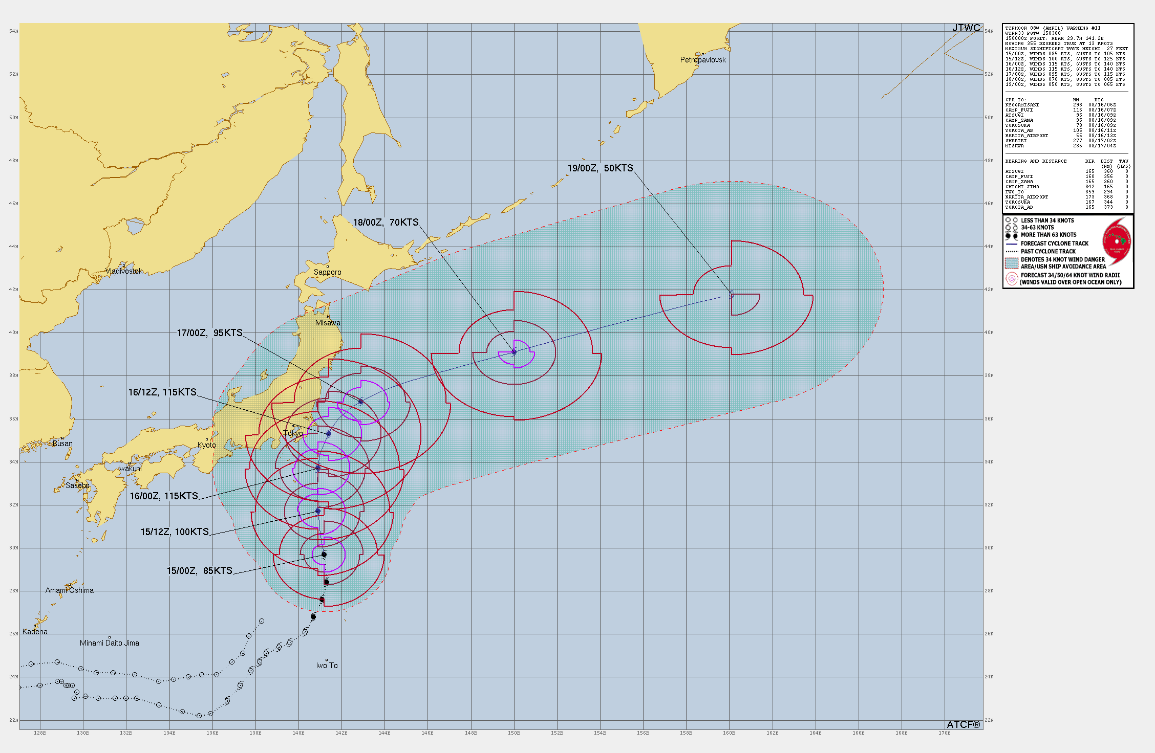 MODEL DISCUSSION: DETERMINISTIC MODEL GUIDANCE IS IN TIGHT AGREEMENT THROUGH TAU 48 WITH A MINIMUM CROSS-TRACK SPREAD OF 65NM, BUT THE ALONG-TRACK SPREAD OPENS TO 300NM BY TAU 96, WHICH LOWERS THE UNCERTAINTY IN THE TRACK FORECAST AFTER THE SYSTEM ROUNDS THE CURVE OF THE STR TO THE EAST. THE GEFS AND ECENS ENSEMBLE GUIDANCE DEPICTS SOLUTIONS FARTHER WEST AND CLOSER TO THE BOSO PENINSULA THAN CONVEYED IN THE MULTI-MODEL CONSENSUS. THE JTWC INTENSITY GUIDANCE STRONGLY INDICATES HIGHER PROBABILITY OF RAPID INTENSIFICATION WITHIN THE FIRST 24 HOURS OF THE FORECAST PARTICULARLY DUE TO THE ELEVATED SEA SURFACE TEMPERATURES BETWEEN 30-31C, STRONG UPPER-LEVEL DIVERGENCE, AND LOW VERTICAL WIND SHEAR. THE JTWC INTENSITY FORECAST LIES ABOVE THE MULTI-MODEL CONSENSUS, WHICH IS DRAWN LOWER DUE TO GFS, HAFS-A, AND COAMPS-TC.