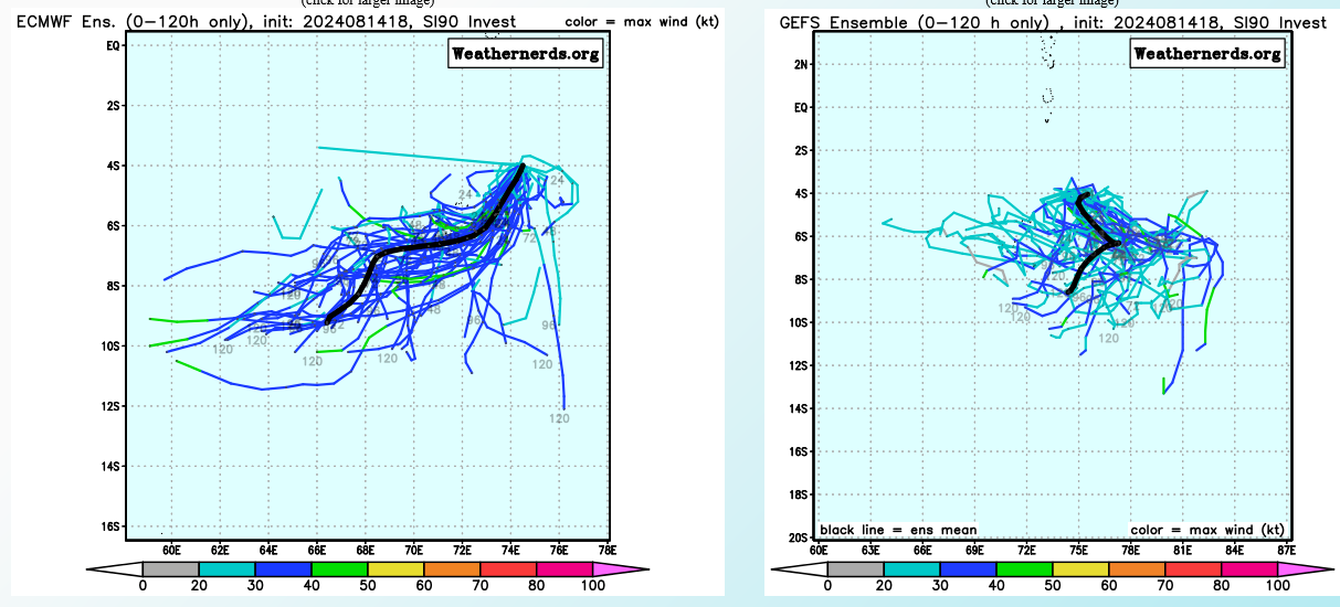 AN AREA OF CONVECTION (INVEST 90S) HAS PERSISTED NEAR 4.0S 74.5E, APPROXIMATELY 277 NM NORTHEAST OF DIEGO GARCIA. ENHANCED INFRARED SATELLITE IMAGERY AND A 142328Z GMI 89GHZ SATELLITE IMAGERY DEPICTS A PARTIALLY EXPOSED CIRCULATION WITH LOOSELY DEFINED CLOUD LINES IN THE LOW LEVELS BEGINNING TO CONSOLIDATE. ENVIRONMENTAL ANALYSIS REVEALS THAT 90S IS IN A MARGINALLY FAVORABLE ENVIRONMENT FOR DEVELOPMENT, WITH WARM SST (27-28C), HIGH VWS (>25KTS), AND GOOD UPPER LEVEL OUTFLOW. MODEL GUIDANCE IS IN GOOD AGREEMENT THAT 90S WILL CONTINUE TO TRACK WEST-SOUTHWESTWARD OVER THE NEXT 48 HOURS. MAXIMUM SUSTAINED SURFACE WINDS ARE ESTIMATED AT 13 TO 18 KNOTS. MINIMUM SEA LEVEL PRESSURE IS ESTIMATED TO BE NEAR 1006 MB. THE POTENTIAL FOR THE DEVELOPMENT OF A SIGNIFICANT TROPICAL CYCLONE WITHIN THE NEXT 24 HOURS IS LOW.
