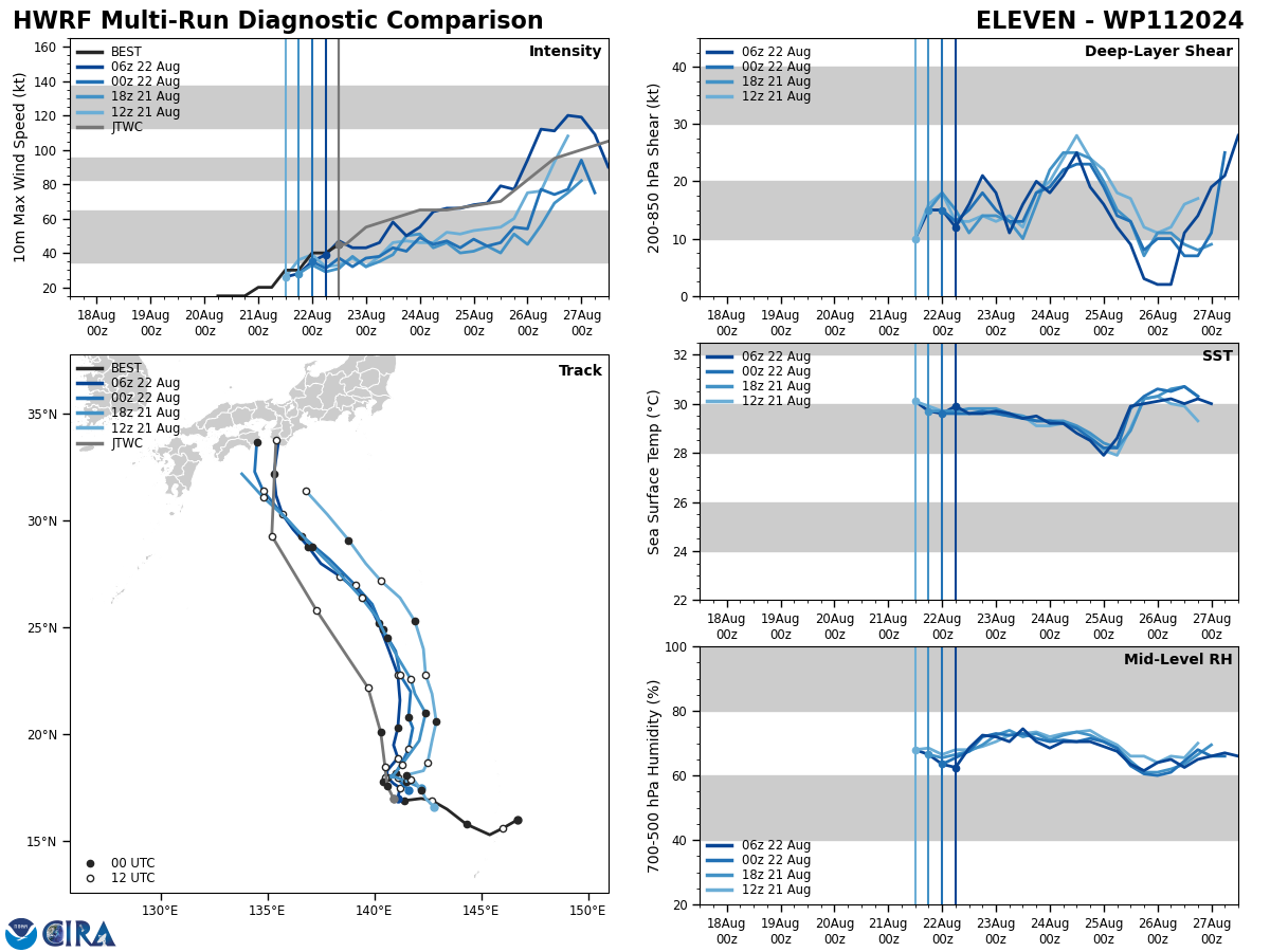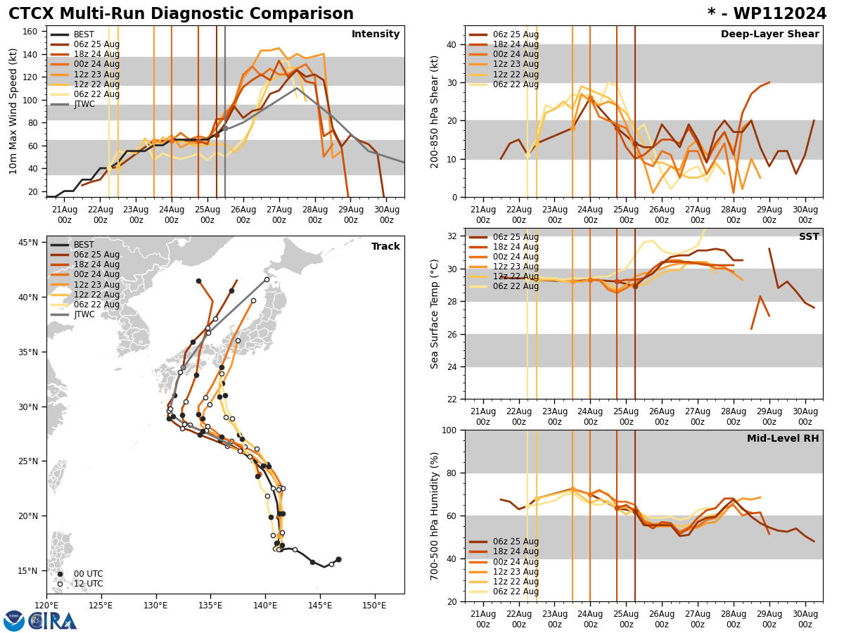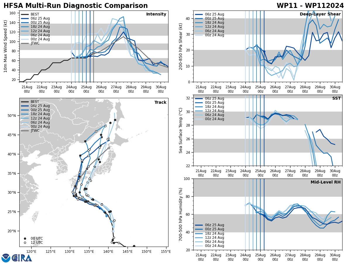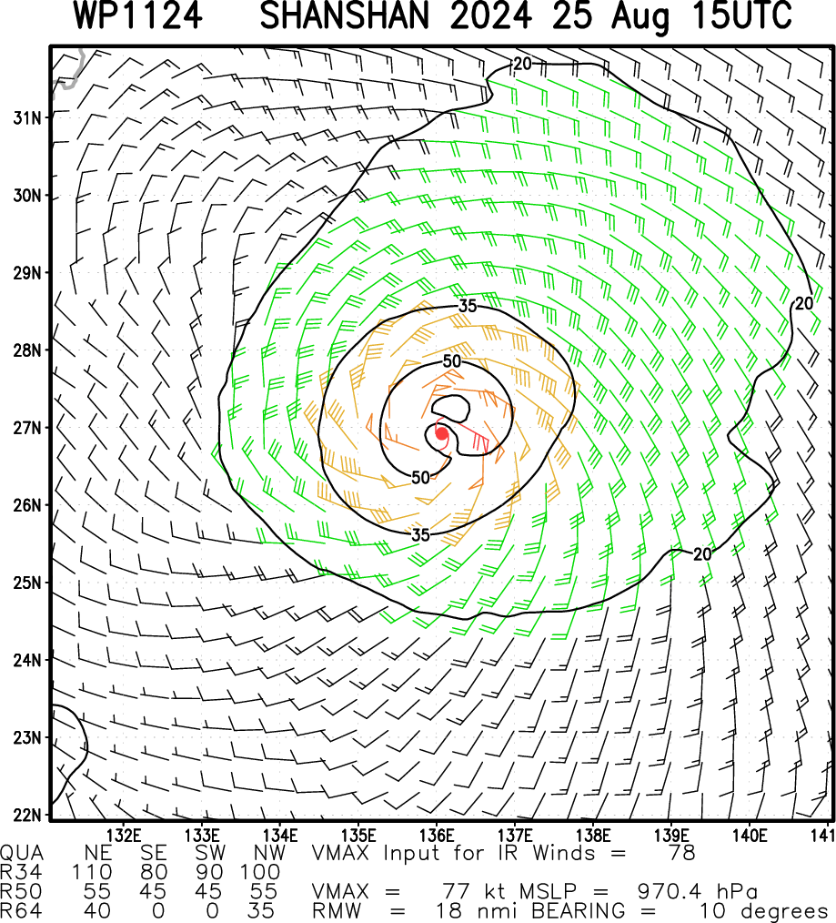 FORECAST REASONING. SIGNIFICANT FORECAST CHANGES: THERE ARE NO SIGNIFICANT CHANGES TO THE FORECAST FROM THE PREVIOUS WARNING. FORECAST DISCUSSION: TYPHOON SHANSHAN WILL CONTINUE ON A FISHBONE NORTHWESTWARD TRACK AS THE STEERING STR BUILDS. AFTER TAU 36, IT WILL TURN MORE NORTHWARD AS IT CRESTS THE STR AXIS AND AFTER TAU 48, ACCELERATE NORTHEASTWARD ON THE POLEWARD SIDE OF THE STR AND BY TAU 72, MAKE LANDFALL OVER SHIKOKU THEN TRACK ACROSS HONSHU AND EXIT INTO THE SEA OF JAPAN (SOJ) AROUND TAU 90. BY TAU 120, IT WILL MAKE LANDFALL OVER THE SOUTHERN TIP OF HOKKAIDO. THE FAVORABLE ENVIRONMENT WILL FUEL A GRADUAL INTENSIFICATION TO A PEAK OF 110KTS BY TAU 48 AS THE POLEWARD OUTFLOW, ENHANCED BY THE STRONG WESTERLIES, IS AMPLIFIED. AFTERWARD, LAND INTERACTION, INCREASING VWS, AND COOLER SST IN THE SOJ WILL RAPIDLY ERODE THE SYSTEM DOWN TO 45KTS BY TAU 120. CONCURRENTLY BY TAU 72, TY 11W WILL BEGIN EXTRA-TROPICAL TRANSITION (ETT) AS IT ENTERS THE COLD BAROCLINIC ZONE AND BECOME A STRONG GALE-FORCE COLD CORE LOW WITH AN EXPANDING WIND FIELD BY TAU 120.