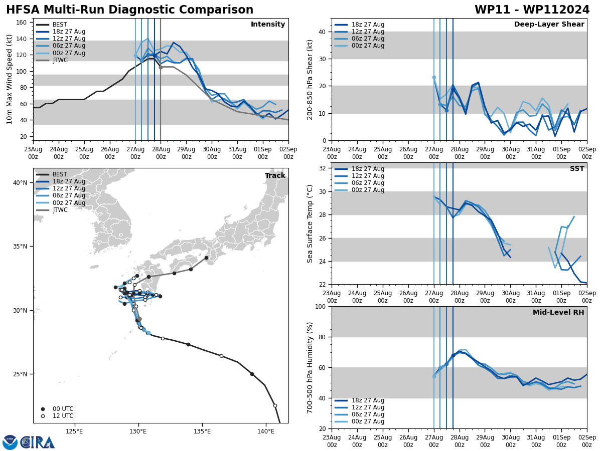 SATELLITE ANALYSIS, INITIAL POSITION AND INTENSITY DISCUSSION: ANIMATED MULTISPECTRAL SATELLITE IMAGERY (MSI) DEPICTS A TYPHOON STRUCTURE THAT HAS DECAYED SOMEWHAT SINCE THE PREVIOUS WARNING. THE EYE HAS COOLED AND BECOME LESS CLOUD-FREE, COINCIDENT WITH A SLIGHT WARMING OF THE EYEWALL CLOUD TOPS AND COMPLETE EROSION OF THE WESTERN EYEWALL IN JAPANESE RADAR IMAGERY. THIS COULD BE DUE TO EARLY ONSET OF OCEANIC UPWELLING BENEATH THE STORM, COUPLED WITH THE IMPACTS OF ONGOING LIGHT TO MODERATE NORTHWESTERLY SHEAR, BUT OCEANIC COOLING IS DIFFICULT TO CONFIRM. THE STORM BRIEFLY SLOWED AND TOOK A NORTHWARD JOG DURING THE PAST SIX HOURS, WHICH MAY HAVE EXACERBATED ANY UPWELLING THAT IS OCCURRING. POLEWARD UPPER-LEVEL OUTFLOW HAS RECOVERED SOMEWHAT IN THE NORTHERN SEMICIRCLE IN RESPONSE TO THE TROUGH OVER THE SEA OF JAPAN, BUT OUTFLOW REMAINS CONCENTRATED PRIMARILY EASTWARD AND EQUATORWARD. THE INITIAL INTENSITY IS LOWERED TO 105 KT BASED ON A BLEND OF AGENCY DVORAK ESTIMATES AND OBJECTIVE SATELLITE ESTIMATES, ALONG WITH A 272112Z RCM-2 SAR IMAGE SHOWING A MAXIMUM SURFACE WIND ESTIMATE OF 107 KT. ONOAIDA, JAPAN LOCATED ABOUT 60 NM NORTH-NORTHEAST OF THE EYE IS CURRENTLY MEASURING SUSTAINED WINDS OF 48 KT.