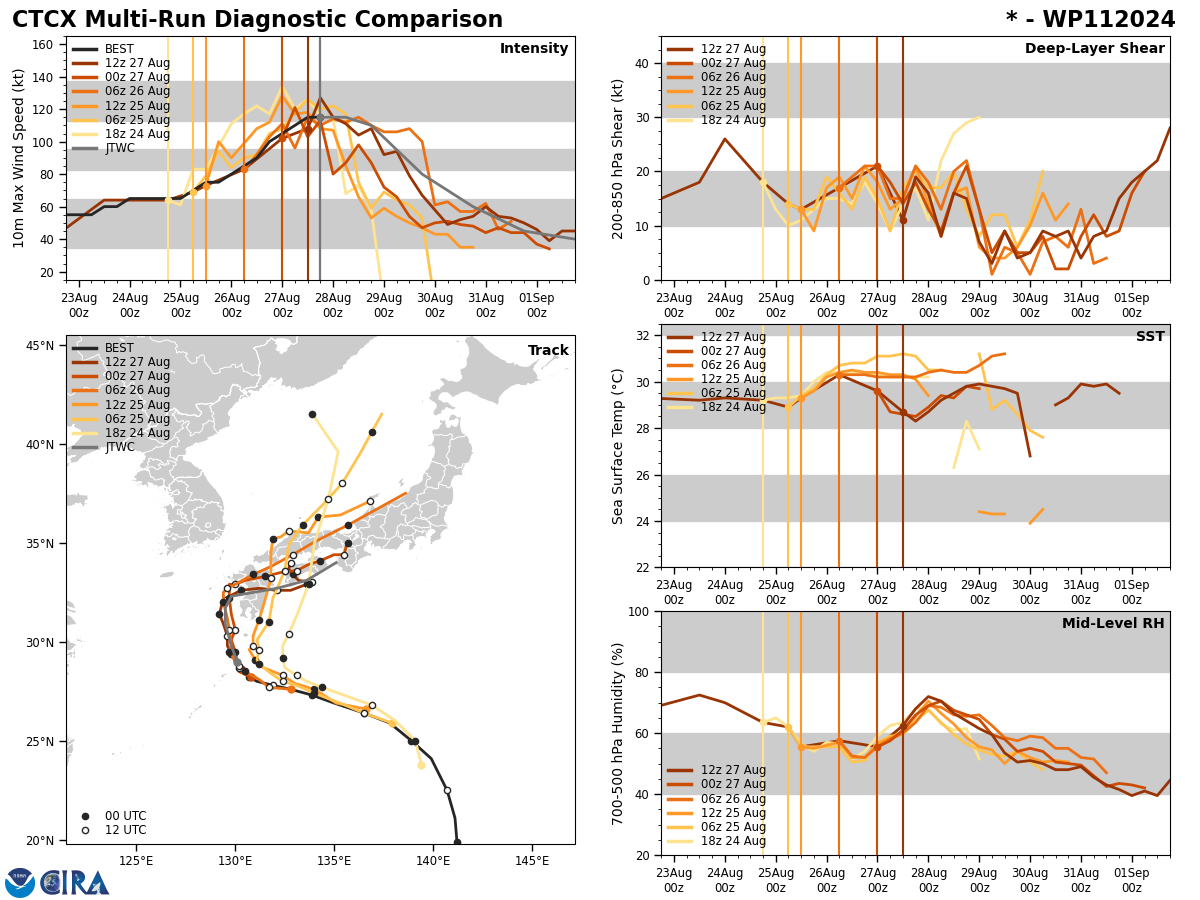 FORECAST REASONING. SIGNIFICANT FORECAST CHANGES: THERE ARE NO SIGNIFICANT CHANGES TO THE FORECAST FROM THE PREVIOUS WARNING. FORECAST DISCUSSION: TYPHOON 11W (SHANSHAN) CONTINUES TO MOVE LETHARGICALLY THROUGH THE RYUKYU ISLAND CHAIN. STEERING CURRENTS ARE WEAK AS THE TYPHOON IS MIRED JUST SOUTHEAST OF A COL IN THE DEEP-LAYER STEERING FLOW NEAR THE SOUTHERN KOREA PENINSULA. AN UPPER-LEVEL TROUGH OVER THE SEA OF JAPAN IS EXPECTED TO ALLOW SHANSHAN TO CONTINUE MAKING PROGRESS NORTH-NORTHWESTWARD OR NORTHWARD DURING THE NEXT 36 HOURS, BUT WILL THEN PULL OUT TO THE NORTHEAST, LEAVING THE STORM IN EVEN WEAKER STEERING CURRENTS. AT THIS POINT, MODELS GENERALLY AGREE THAT A VERY SLOW BUT SHARP TURN TOWARDS THE EAST WILL TAKE PLACE AS A WEAK RIDGE BUILDS IN SOUTHEAST OF THE TYPHOON, BRINGING SHANSHAN INLAND OVER KYUSHU BETWEEN 36 AND 48 HOURS. DURING THIS TURN, WIND SHEAR IS EXPECTED TO BE LOW, BUT OCEAN HEAT CONTENT VALUES DECREASE SIGNIFICANTLY IN THE WATERS SOUTH OF SASEBO RELATIVE TO WHERE SHANSHAN IS NOW. COMBINED WITH A SLOW FORWARD MOTION OF 5 KT OR LESS, THIS WILL RESULT IN MORE ACUTE OCEANIC COOLING BENEATH THE STORM THAN IS CURRENTLY OCCURRING, LEADING TO A MORE RAPID PACE OF WEAKENING JUST BEFORE LANDFALL. THE JTWC FORECAST SHOWS WEAKENING TO 80 KT PRIOR TO LANDFALL, BUT THE LANDFALL INTENSITY WILL BE SENSITIVE TO EXACTLY HOW LONG IT TAKES THE TYPHOON TO TRANSIT THE WATERS SOUTHWEST OF KYUSHU. AFTER LANDFALL, MODELS BEGIN TO DISAGREE SIGNIFICANTLY ON THE STORM'S TRACK DUE TO CONTINUING WEAK STEERING CURRENTS, WITH THE JET STREAM STAYING WELL NORTH OF THE STORM. A SECOND UPPER-LEVEL TROUGH IS EXPECTED TO BRIEFLY DIG INTO NORTHEASTERN CHINA AND SOUTHEASTERN RUSSIA IN ABOUT 72 HOURS, WHICH SOME MODELS LIKE GALWEM AND JGSM EXPECT TO BE STRONG ENOUGH TO USHER SHANSHAN NORTHEASTWARD INTO HONSHU. HOWEVER, THIS TROUGH ALSO EXITS QUICKLY, AND OTHER MODELS LEAVE SHANSHAN MAROONED SOUTH OF THE JETSTREAM EVEN AFTER THIS SECOND TROUGH PASSES, EITHER STALLING OR MOVING SLOWLY EASTWARD. THE GFS AND HAFS MODELS EVEN DEPICT A MEANDERING, LOOPING TRACK BACK WESTWARD OVER KYUSHU. THE JTWC FORECAST MAINTAINS A SLOW EAST-NORTHEASTWARD MOTION NEAR SHIKOKU DURING THE 72-120 HOUR PERIOD, BUT THERE IS HIGHER THAN AVERAGE UNCERTAINTY IN THE TRACK AFTER 48 HOURS, AND ERRATIC STORM MOTION IS POSSIBLE IN THE VICINITY OF KYUSHU AND SHIKOKU. THERE IS ALSO LOWER CONFIDENCE IN THE INTENSITY DURING THIS PORTION OF THE TRACK, AS THE STORM COULD REMAIN OVER LAND OR MOVE BACK OVER WATER SOUTH OF JAPAN FOR A TIME. HOWEVER, WEAKENING IS GENERALLY EXPECTED AFTER THE INITIAL LANDFALL DUE TO CONTINUING LAND INTERACTION AND THE PRESENCE OF DRY AIR AROUND THE STORM DEPOSITED BY THE PASSING UPPER-LEVEL TROUGHS.