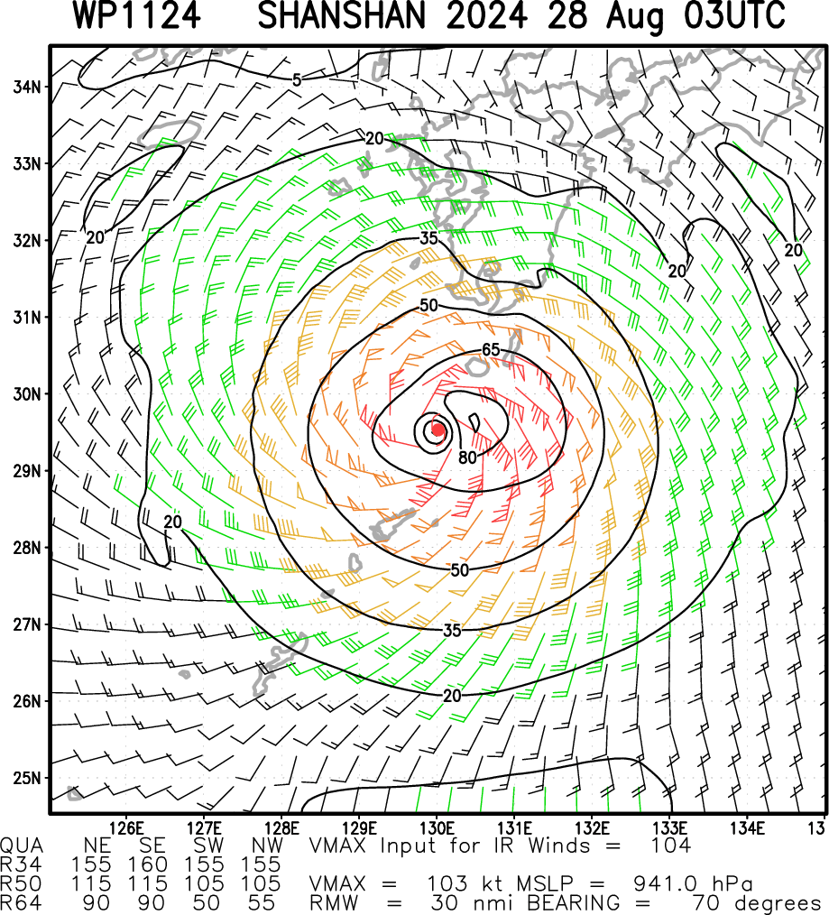 WESTERN NORTH PACIFIC: TY 11W(SHANSHAN). 28/00UTC ESTIMATED INTENSITY IS 105 KNOTS/CAT 3 US: STABLE OVER 24H. PEAK INTENSITY WAS 115 KNOTS/CAT 4