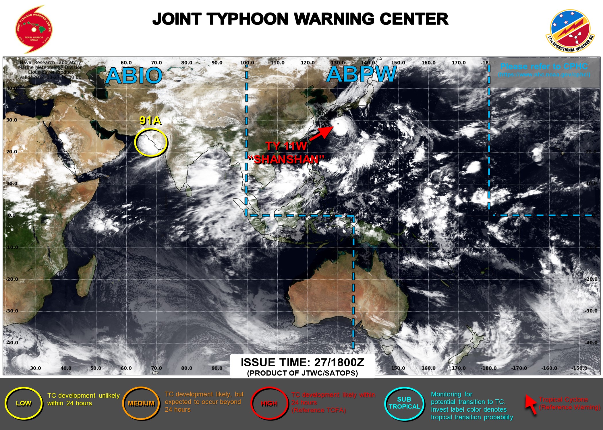 AN AREA OF CONVECTION (INVEST 91A) HAS PERSISTED NEAR 24.3N 70.5E, APPROXIMATELY 189 NM EAST OF KARACHI, PAKISTAN. ENHANCED INFRARED IMAGERY AND A 271328Z SSMIS F-17 91GHZ SATELLITE IMAGE DEPICTS A BROAD BUT WELL-DEFINED CIRCULATION WITH DEEP CONVECTION IN THE SOUTHWEST QUADRANT. SCATTEROMETERY DATA SHOWS OFFSHORE FLOW OF WESTERLY WINDS PEAKING AT 25 KNOTS. 91A IS IN A MARGINALLY FAVORABLE ENVIRONMENT FOR DEVELOPMENT WITH GOOD EQUATORWARD OUTFLOW, BUT ITS LOCATION IS CURRENTLY OVER LAND, HINDERING DEVELOPMENT. MODELS ARE IN GOOD AGREEMENT THAT 91A WILL TRACK WESTWARD OVER THE ARABIAN SEA DURING THE NEXT 48 HOURS, WHERE WARM SEA SURFACE TEMPERATURES (28-29C) AND MODERATE VWS (15-20KTS) WOULD REPRESENT AN OVERALL FAVORABLE ENVIRONMENT FOR DEVELOPMENT. MAXIMUM SUSTAINED SURFACE WINDS ARE ESTIMATED AT 28 TO 33 KNOTS. MINIMUM SEA LEVEL PRESSURE IS ESTIMATED TO BE NEAR 993 MB. THE POTENTIAL FOR THE DEVELOPMENT OF A SIGNIFICANT TROPICAL CYCLONE WITHIN THE NEXT 24 HOURS IS UPGRADED TO LOW.