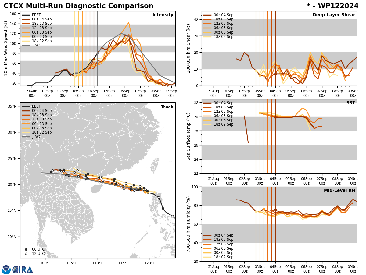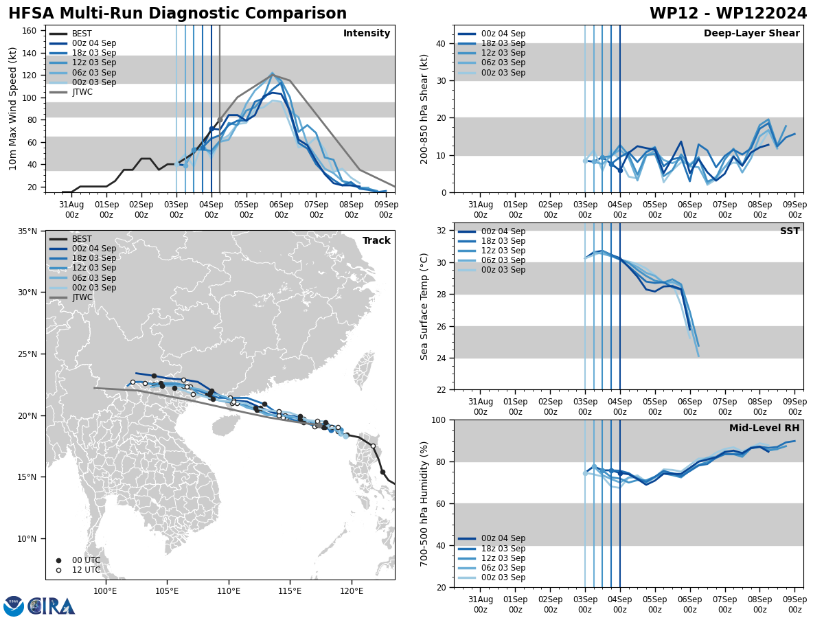 MODEL DISCUSSION: DETERMINISTIC MODEL GUIDANCE IS IN GOOD AGREEMENT THAT THE SYSTEM WILL TRACK WEST-NORTHWESTWARD THROUGH TAU 96. THE MODEL TRACKERS ONLY APPEAR TO STRUGGLE AFTER TY 12W PASSES OVER THE TALL MOUNTAINOUS TERRAIN, WHICH WILL CAUSE THE VORTEX TO SHALLOW AND BECOME DIFFICULT TO TRACK AND PREDICT. THE INTENSITY GUIDANCE IS IN MODERATE AGREEMENT THAT A PEAK WILL OCCUR AT TAU 36 BEFORE CONSISTENT WEAKENING, BUT SOME OF THE JTWC CONSENSUS MEMBERS FORECAST A PEAK AS LOW AS 90KTS (GFS) OR AS HIGH AS 135KTS (RICN AND RIPA).