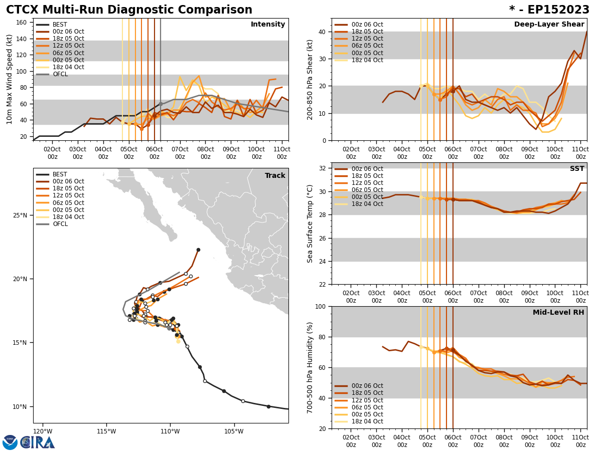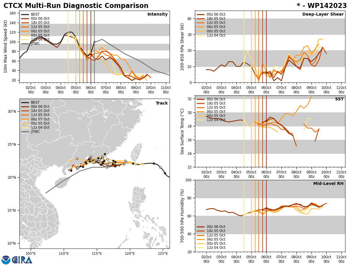 MODEL DISCUSSION: GLOBAL NUMERICAL MODEL GUIDANCE IS IN EXCEPTIONAL AGREEMENT THAT TY 14W WILL CONTINUE ON A WESTWARD TRACK THROUGH TAU 48 AND THEN GRADUALLY TURN SOUTHWESTWARD AND MAINTAIN TRACK THROUGH TAU 120. HOWEVER, THE TRACK SPEED SHOWS MODERATE UNCERTAINTY BY TAU 72 WITH AN ALONG-TRACK SPREAD OF 153NM. THE SAME UNCERTAINTY COMPOUNDS AT TAU 120, WITH AN ALONG-TRACK SPREAD OF 330NM AND A CROSS-TRACK SPREAD OF 240NM. BRIEFLY DISCUSSING THE RAPID INTENSIFICATION OCCURRENCE, THE ONLY INDICATIONS OF INTENSIFICATION PRESENTED IN THE OBJECTIVE AID INTENSITIES FOR THE PREVIOUS FORECAST WERE COAMPS-TC AND HAFS-A, EACH SUGGESTING JUST A 5 KNOT RISE IN INTENSITY. PRESENTLY, HAFS-A AND STATISTICAL-DYNAMICAL INTENSITY GUIDANCE REFLECT THE POSSIBILITY OF A 5 KNOT INCREASE BY TAU 12, ALONG WITH MULTIPLE RAPID INTENSIFICATION INDICATIONS TRIGGERED.