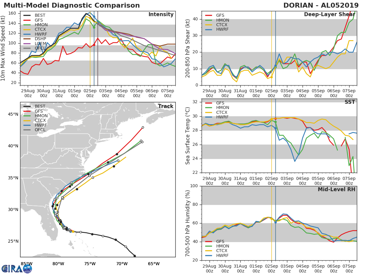 Les modèles sont en accord sur une trajectoire juste au large des côtes américaines avec un affaiblissement graduel même si DORIAN devrait demeurer au moins cyclone intense ces prochaines 48h.