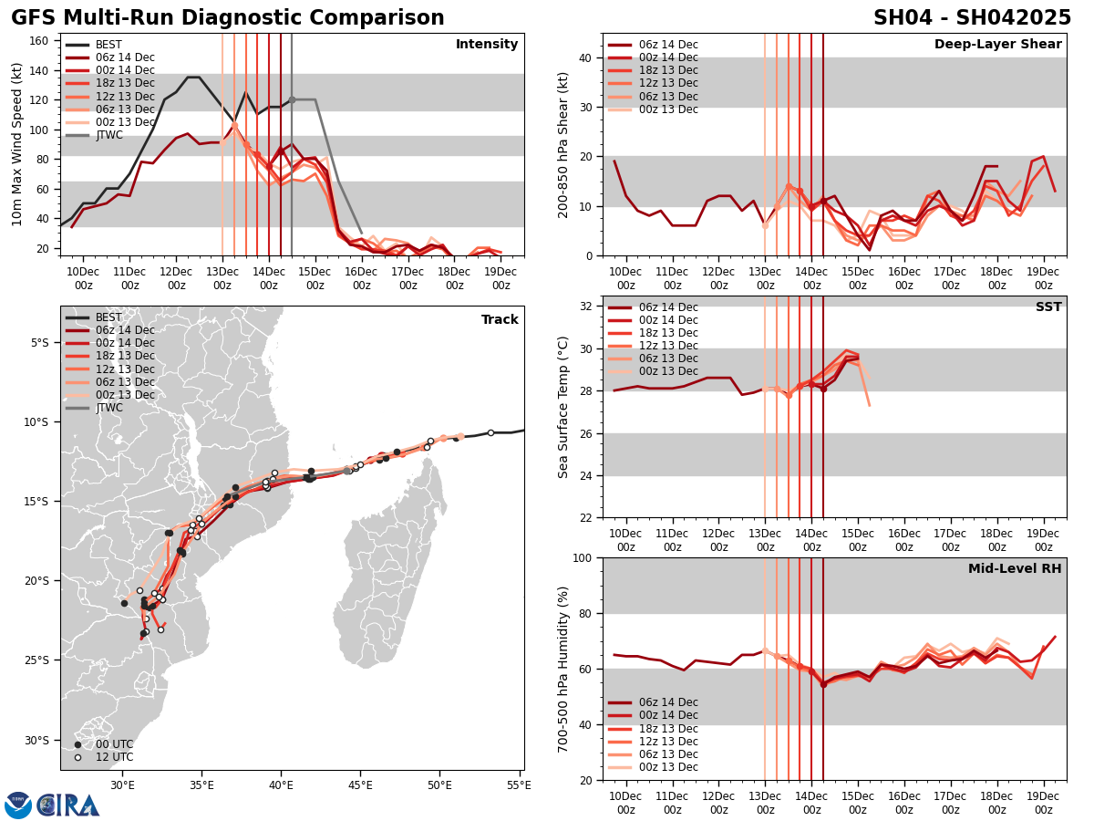 MODEL DISCUSSION: NUMERICAL MODEL GUIDANCE IS IN TIGHT AGREEMENT ON THE TRACK OF 04S WITH A 39 NM CROSS-TRACK SPREAD AT THE TIME OF LANDFALL. AS A RESULT, THE JTWC TRACK FORECAST IS PLACED CLOSE TO CONSENSUS WITH HIGH CONFIDENCE. INTENSITY GUIDANCE IS IN GOOD AGREEMENT, WITH THE EXCEPTION OF GFS, WHICH CONTINUES TO SUGGEST A MUCH WEAKER SYSTEM THAN THE MESOSCALE MODELS. INTENSITY GUIDANCE AS A WHOLE ALSO SUGGESTS SLIGHT WEAKENING OVER THE NEXT 12 HOURS, HOWEVER THE JTWC INTENSITY FORECAST KEEPS THE INTENSITY CONSTANT DUE TO THE FAVORABLE ENVIRONMENT. AFTER TAU 12, THE JTWC INTENSITY FORECAST FOLLOWS CLOSELY TO CONSENSUS WITH MEDIUM CONFIDENCE.