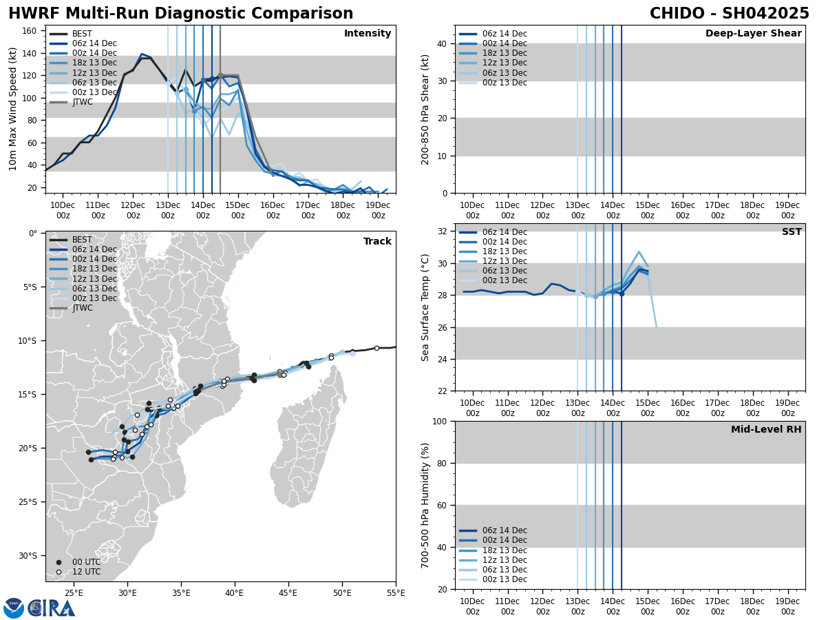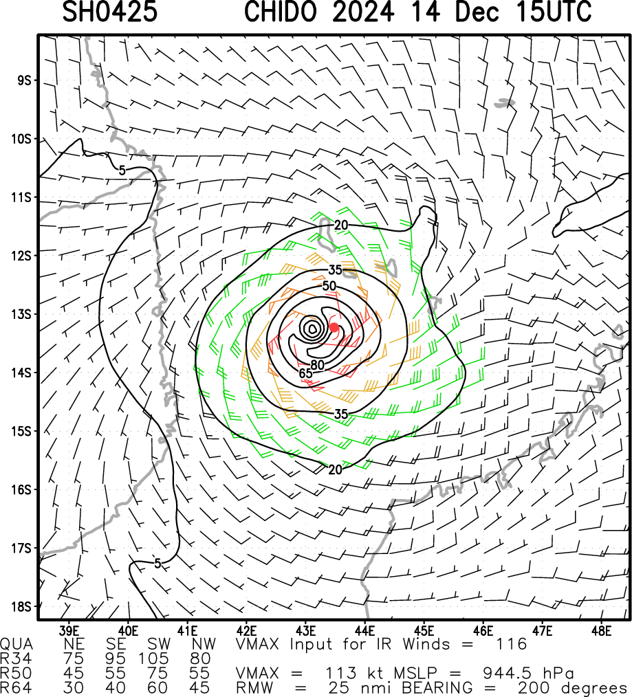 SOUTHERN HEMISPHERE: SOUTH INDIAN OCEAN: TC 04S(CHIDO). 20241214/12UTC ESTIMATED LOCATION AND INTENSITY: 120 KNOTS/CAT 4: -5 KNOTS OVER 24 HOURS